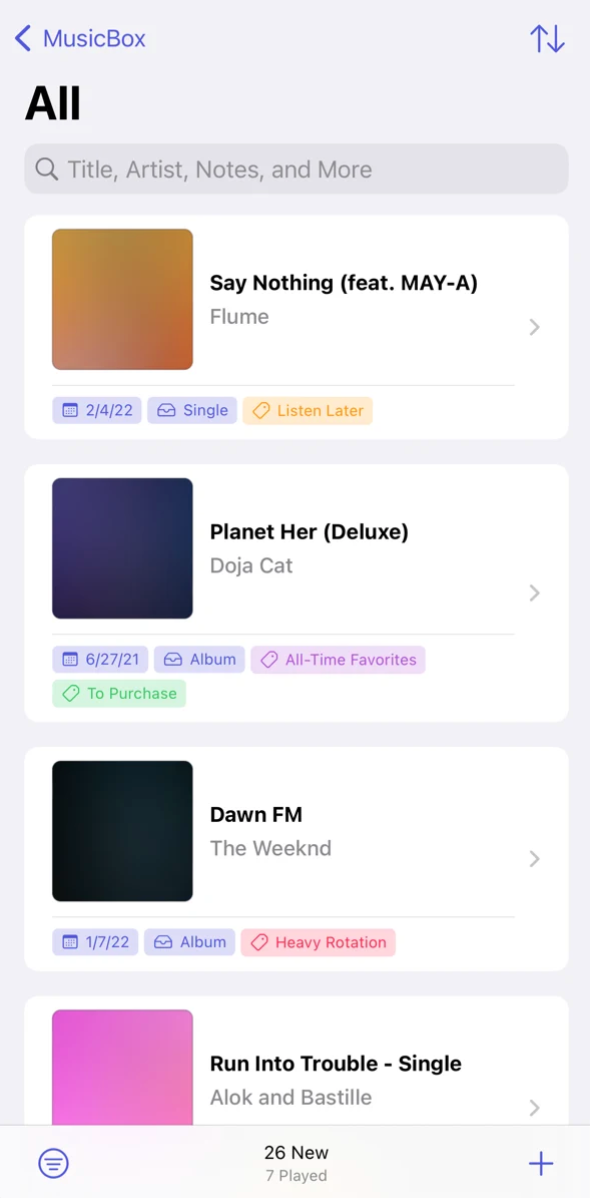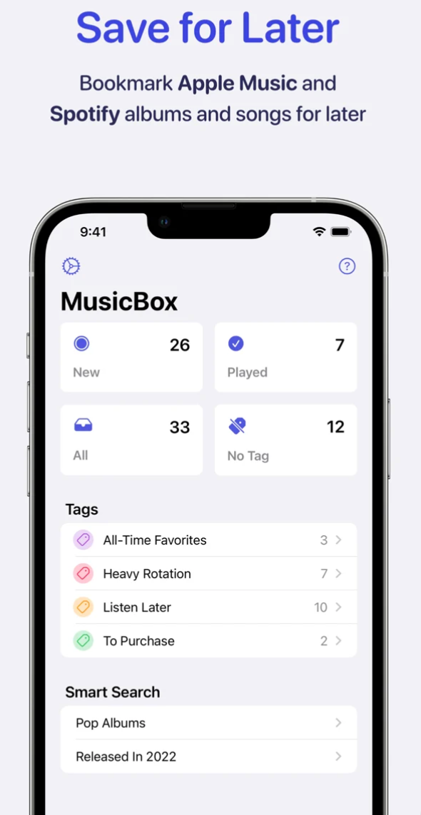 MusicBox představuje spolehlivou a snadnou cestu k ukládání alb i jednotlivých skladeb pro pozdější poslech. Obsah si v této aplikaci můžete také přehledně třídit, označovat štítky, spravovat metadata a provádět celou řadu dalších akcí. MusicBox umí spolupracovat s aplikacemi Apple Music i Spotify, nabízí podporu pro widgety, iCloud a mnoho dalšího.