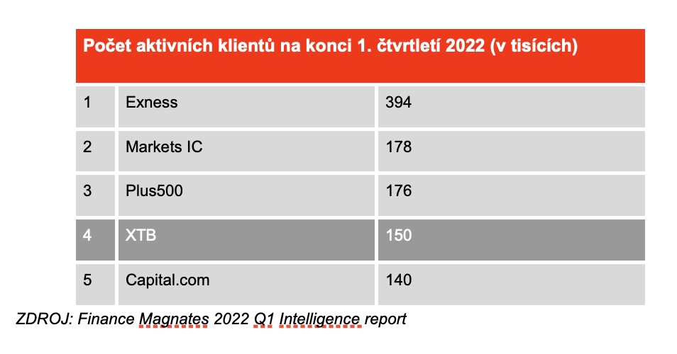 Dalším důležitým parametrem, kterým se XTB odlišuje od konkurence, je nárůst průměrného počtu aktivních klientů. V prvním čtvrtletí to bylo 149,8 tisíc ve srovnání se 103,4 tisíci v prvním čtvrtletí předchozího roku a 112 tisíc v průměru za celý rok 2021. Tento nárůst dovedl XTB do první pětice největších světových FX/CFD brokerů z hlediska počtu aktivních klientů.