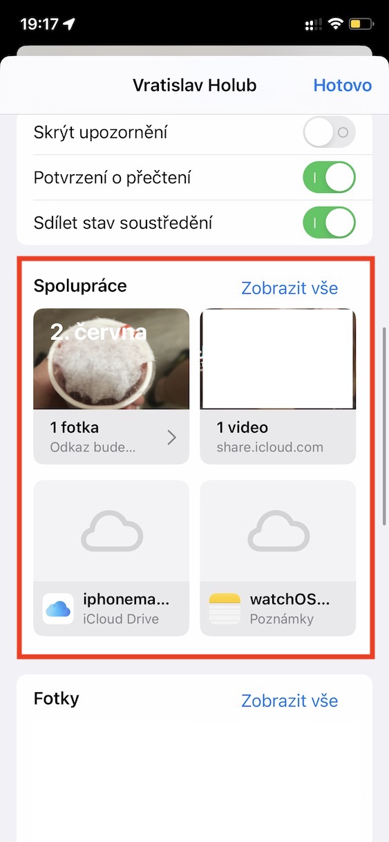 Apple se v rámci iOS a iPadOS 16 hodně zaměřil na možnosti spolupráce s ostatními uživateli a přišel s hromadou nových funkcí, které mohou přijít vhod. Možnosti spolupráce se každopádně nově objevily i ve Zprávách, kde si v jednotlivých konverzacích můžete nechat zobrazit veškerý obsah, na kterém s dotyčným spolupracujete, tj. například sdílené poznámky, fotky na iCloudu, soubory z iCloud Drivu, zkratky a další. Tuto sekci zobrazíte tak, že v konverzaci klepnete nahoře na ikonu a jméno dotyčného, a poté sjedete níže k sekci Spolupráce.