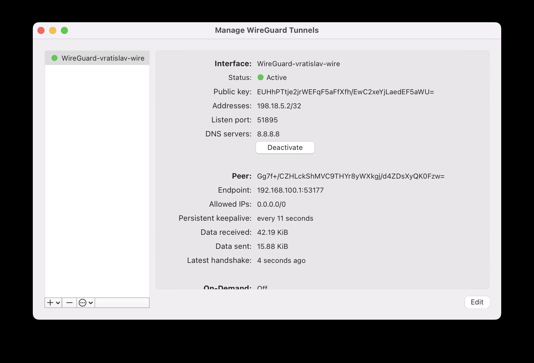 Vytvořený profil se následně ihned zobrazí v seznamu a mimo jeho editace, odstranění a (de)aktivace lze zároveň stáhnout takzvaný konfigurační soubor. Nyní se už můžeme přesunout do aplikace WireGuard, vlevo dole klepnout na ikonku + (plus) > Import Tunnel(s) from File a zvolit zmiňovaný dokument. A máme prakticky hotovo. Osobně ale doporučuji ještě vpravo dole klepnout na tlačítko Edit (úpravu je nutné potvrdit s pomocí hesla/Touch ID) a zkontrolovat, zdali software pracuje se správnými informacemi v sekci Peer. Je potřeba mít nastavenou správnou IP adresu VPN serveru (ať už NASu či routeru, včetně portu).