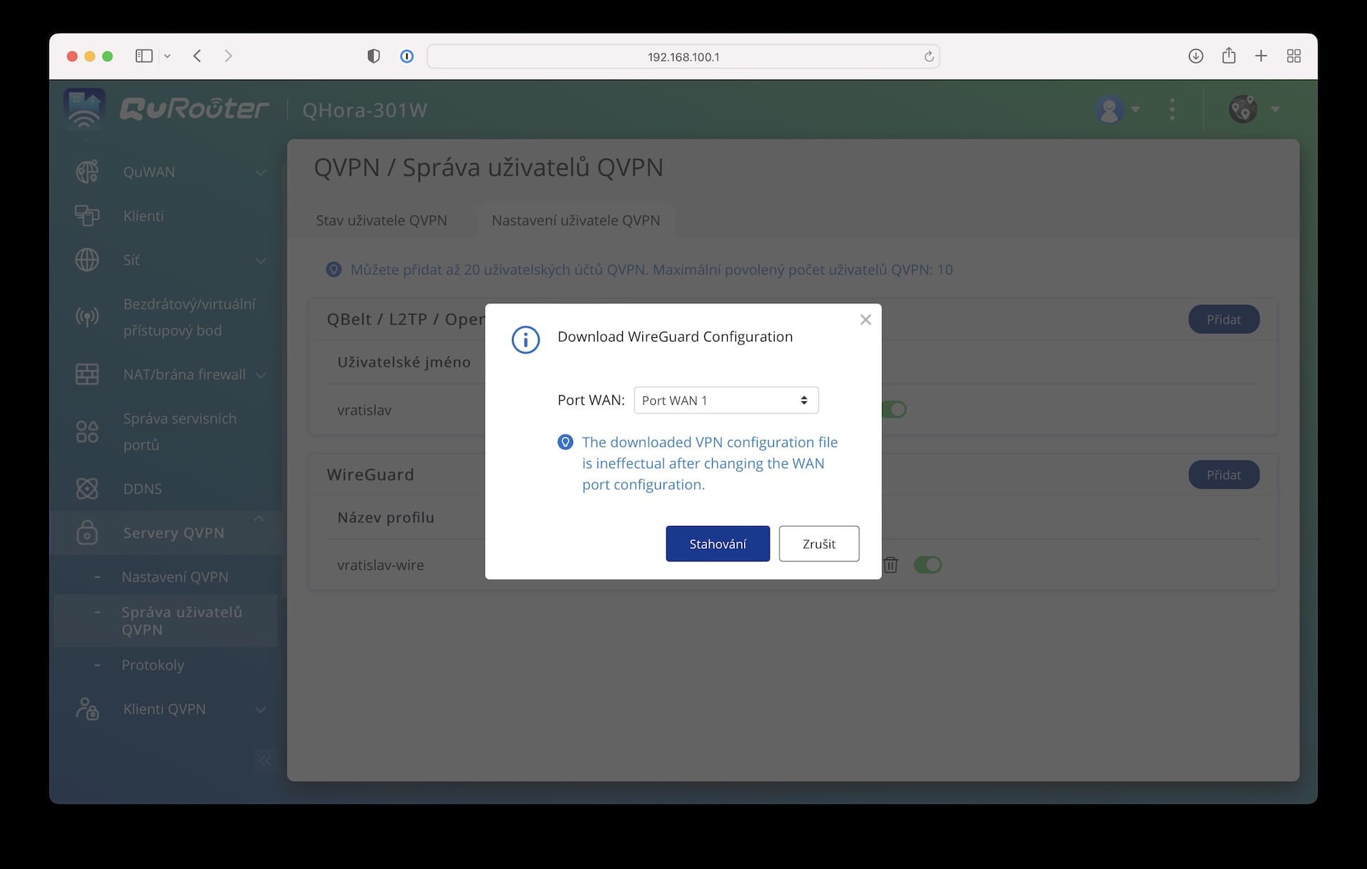 V případě routeru nám stačí otevřít jeho administraci (IP adresu můžeme najít přes Qfinder Pro) a z levého menu vybrat Servery QVPN > Nastavení QVPN. Přesně zde totiž můžeme aktivovat server potřebného protokolu a provést u něj potřebná nastavení. Následně z levého menu přejdeme do Servery QVPN > Správa uživatelů QVPN a nahoře vybereme Nastavení uživatele QVPN. Tady můžeme vytvářet uživatelské profily pro každého, komu chceme vlastně udělit přístup. Naštěstí pro protokoly QBelt, L2TP a OpenVPN jsou profily sdílené.