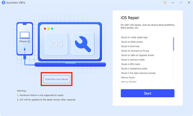 Dobrou zprávou je, že Joyoshare UltFix toho dokáže více než jen opravit bílé pruhy na obrazovce iPhone a více než 150 dalších problémů. Součástí této aplikace je totiž také funkce, díky které můžete váš jablečný telefon rychle přesunout do režimu zotavení. V takovém případě stačí, abyste Joyoshare UltFix spustili, připojili iPhone prostřednictvím kabelu, a poté na hlavní stránce klepnuli v levé části na tlačítko Enter Recovery Mode, čímž dojde k přesunutí do režimu zotavení. Vše je tedy jednoduché a stačí klepnout na jediné tlačítko.