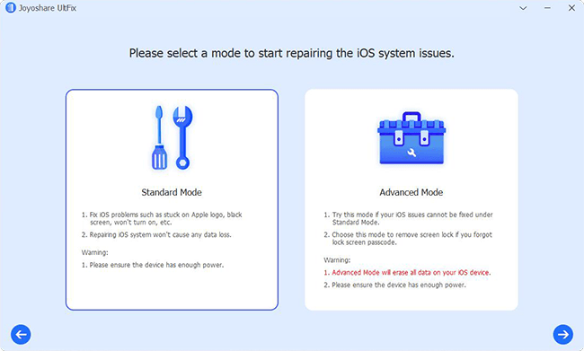 Ve výše uvedeném odstavci jsem zmínil, že při využití Joyoshare UltFix nepřijdete o žádná data. A to je rozhodně ve většině případech pravda, jelikož tato aplikace udělá vše pro to, abyste o žádná data nepřišli. Je ale nutné zmínit, že součástí Joyoshare UltFix je tzv. Dual Mode, se kterým vyřešíte naprosto všechno. Tento Dual Mode konkrétně nabízí dva režimy, a to Standard Mode a Advanced Mode. Při opravě bílých pruhů na obrazovce iPhonu či jakýchkoliv jiných problémů se vždy prvně využije Standard Mode, u kterého nedochází ke smazání dat. Tento režim dokáže vyřešit většinu problémů, se kterými se setkáte. V ojedinělých případech však nemusí být Standard Mode úspěšný – stává se to u extra vážných problémů, se kterými si jiné aplikace neporadí. S Joyoshare UltFix však můžete ještě využít Advanced Mode, u kterého dochází k odstranění dat ze zařízení, avšak s tím, že ve finále získáte zpět alespoň samotný iPhone, který bude funkční.