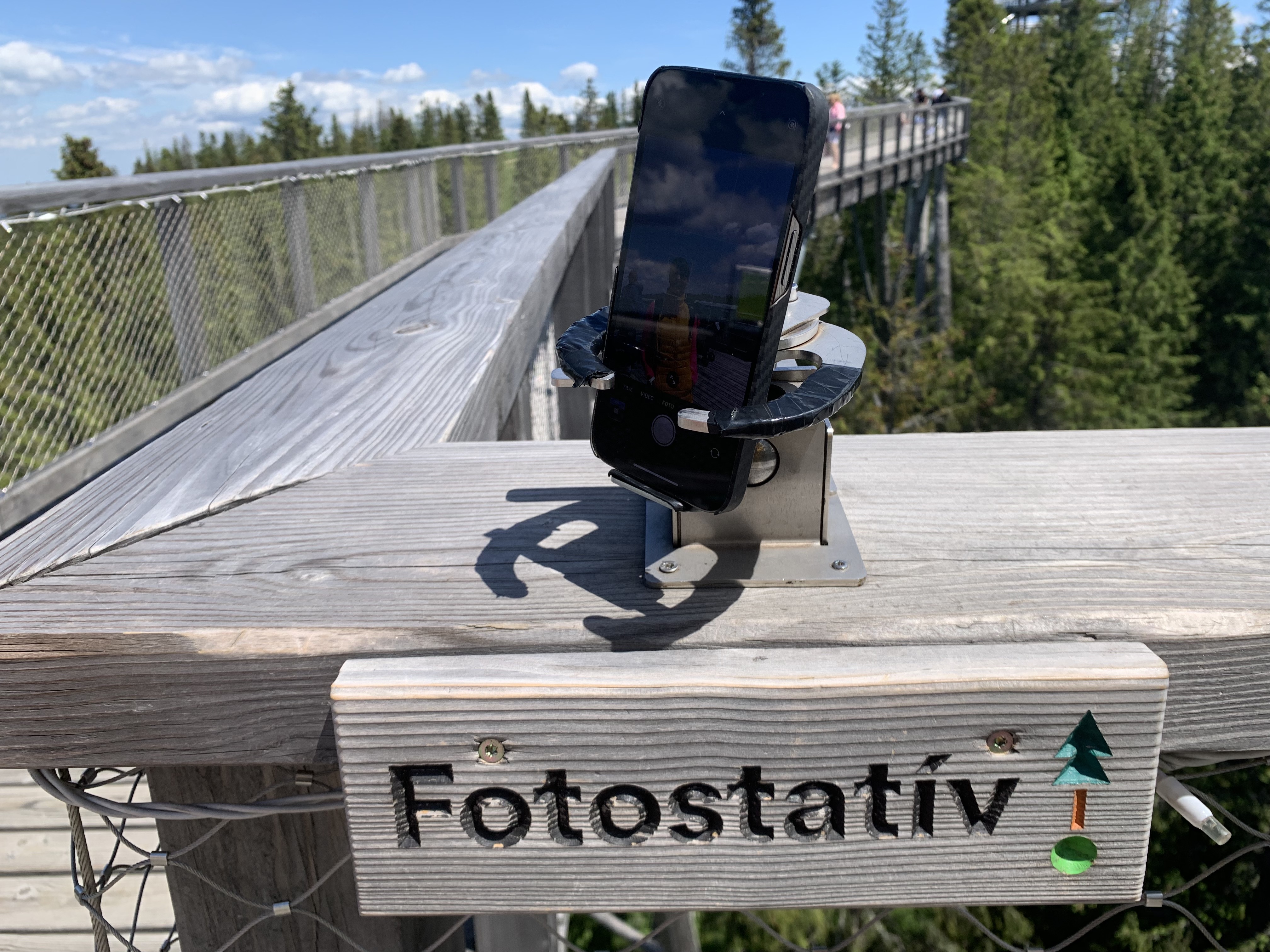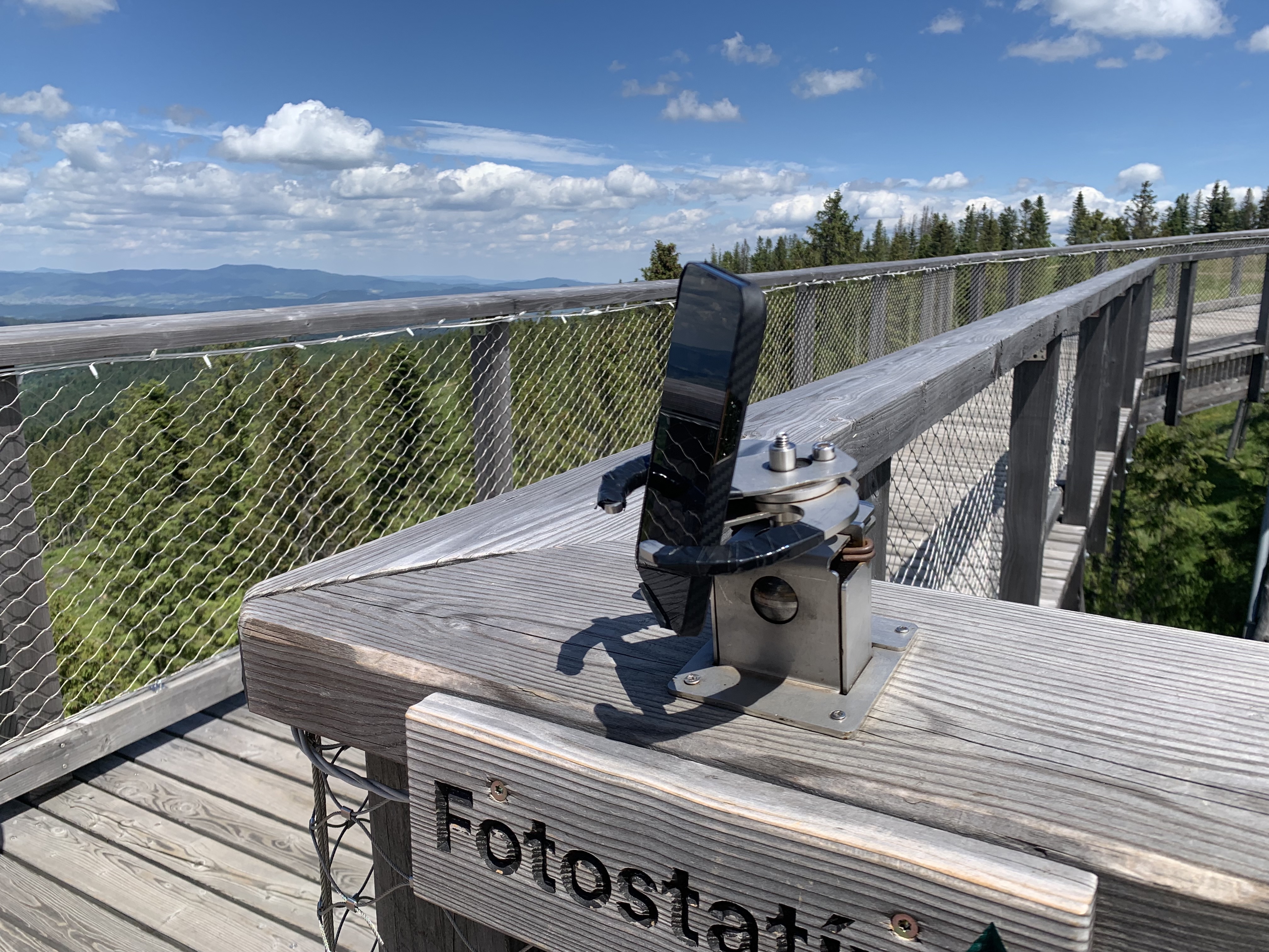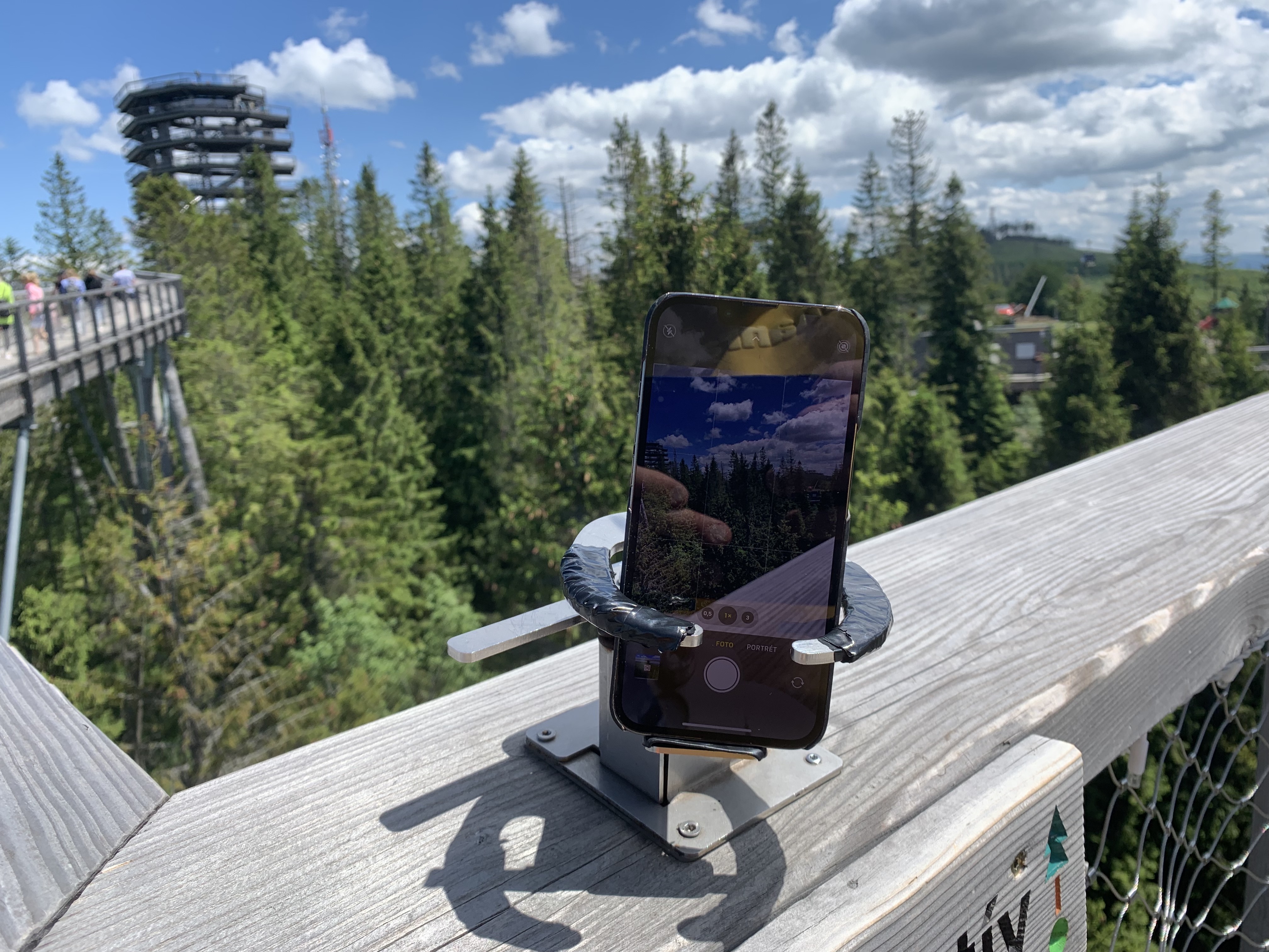 První zajímavostí jsou takzvané fotostativy, na které můžete narazit při procházce korunami stromů v Bachledovské dolině. Mimochodem, samotný chodník korunami stromů rozhodně stojí za návštěvu a mohu jej jen a jen doporučit. Cestou potkáte několik fotostativů, které jsou umístěny na nejlepších fotospotech a mají dvě možnosti využití. Buď si do nich můžete našroubovat svoji zrcadlovku díky klasickému stativovému závitu a nebo do nich můžete snadno zasunout svůj telefon a pomocí kovových ramen si jej zajistit tak, aby pevně držel. Využití je pak celkem jednoznačné, buď pro společné fotky, kde chcete vyfotit všechny, s kým jste do hor vyrazili a nechcete otravovat ostatní turisty nebo v noci na nějakou tu noční fotku s dlouhou expozicí, kterou byste neudrželi v ruce. V noci je totiž chodník celý nasvícen a stojí tak za návštěvu jak ve dne, tak během večera.