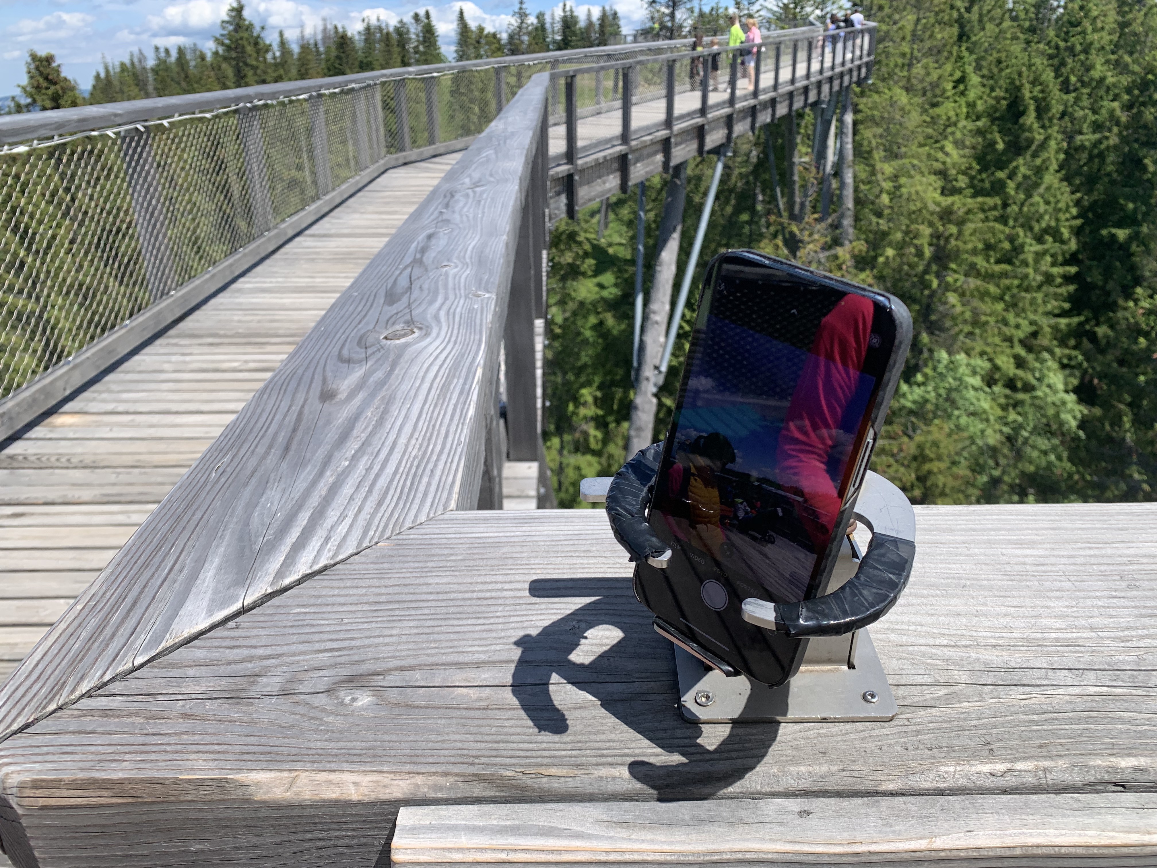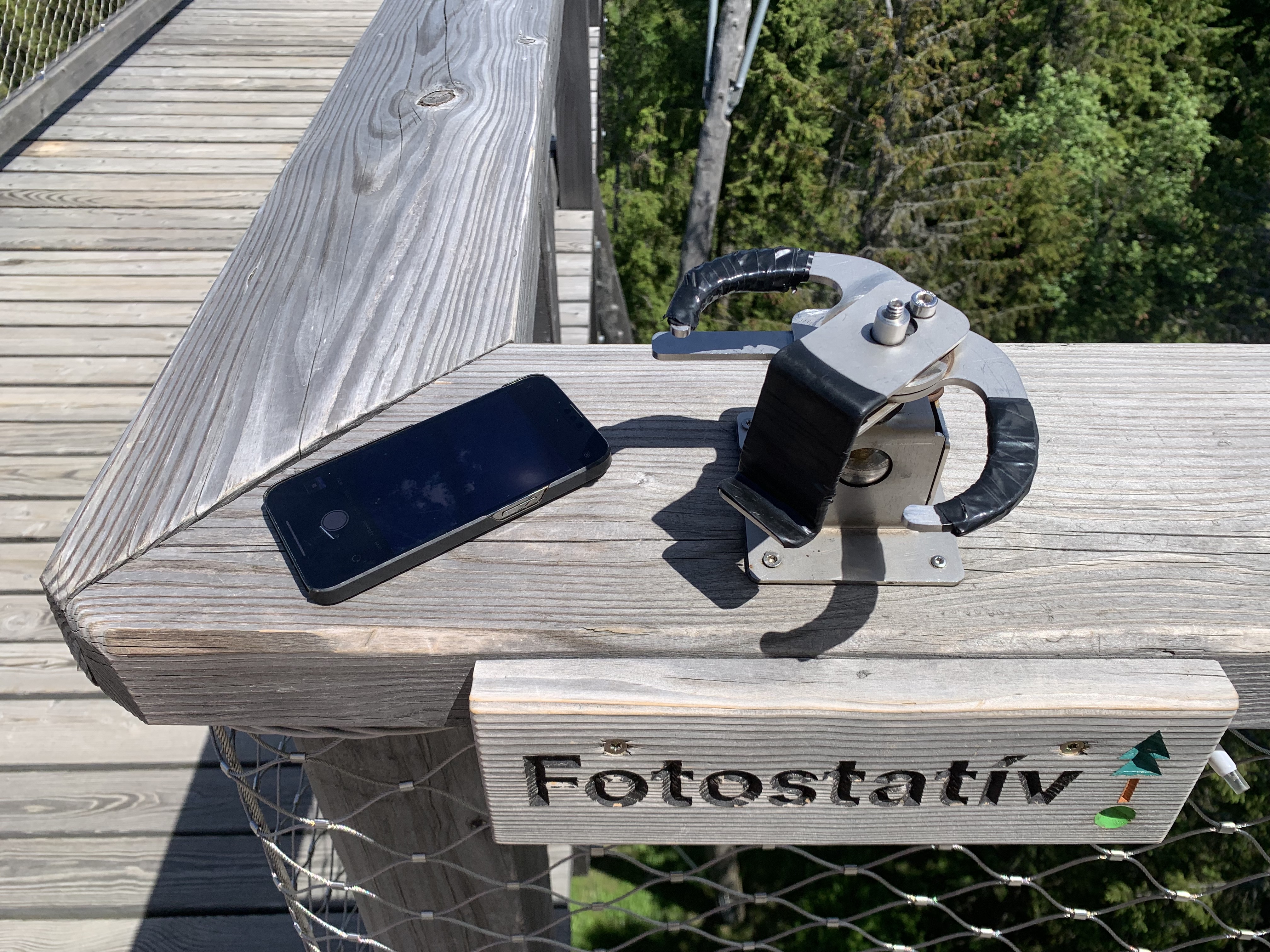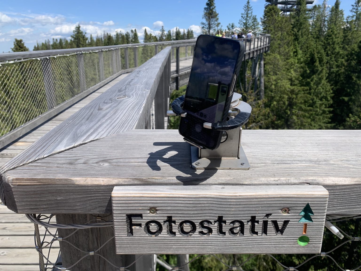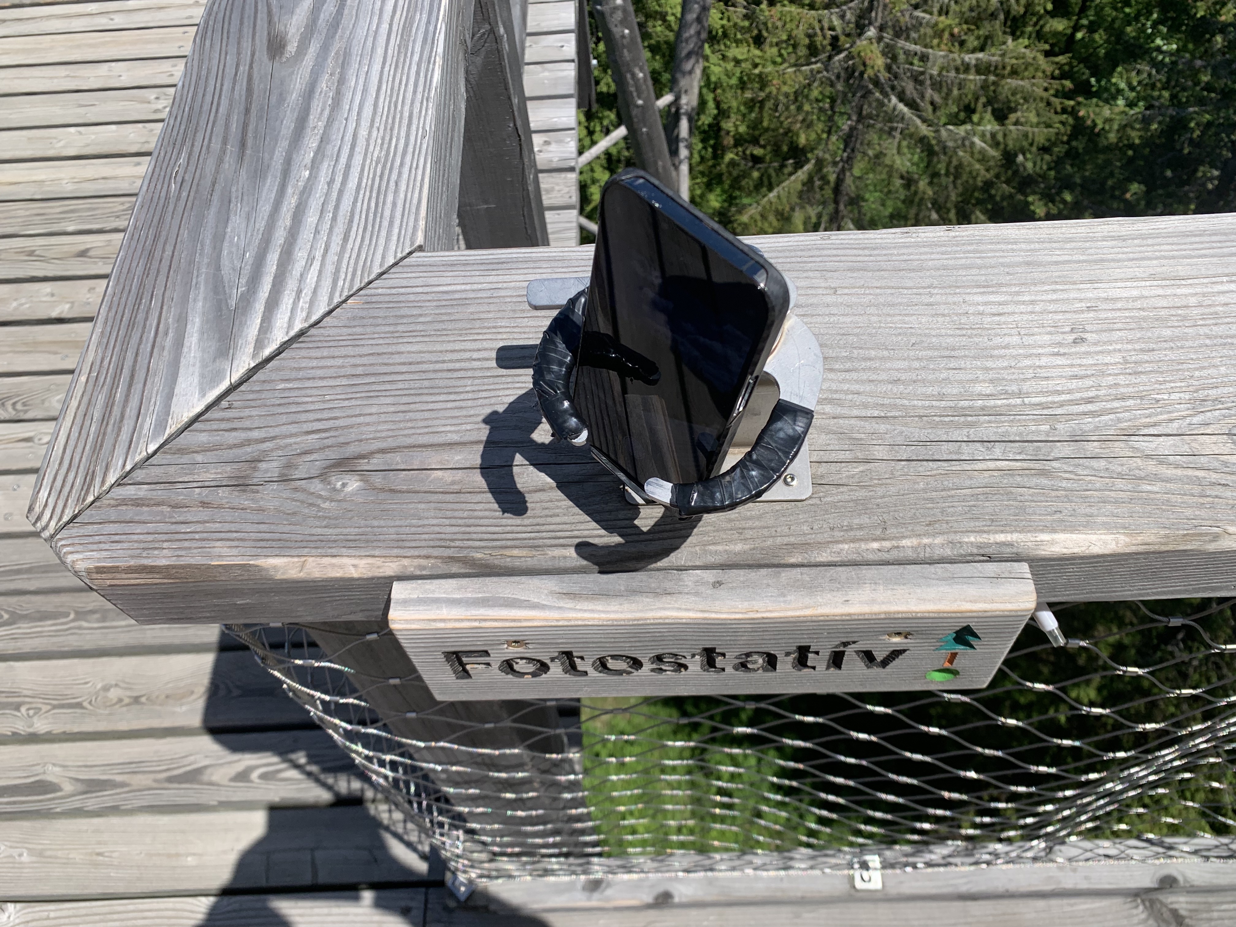 První zajímavostí jsou takzvané fotostativy, na které můžete narazit při procházce korunami stromů v Bachledovské dolině. Mimochodem, samotný chodník korunami stromů rozhodně stojí za návštěvu a mohu jej jen a jen doporučit. Cestou potkáte několik fotostativů, které jsou umístěny na nejlepších fotospotech a mají dvě možnosti využití. Buď si do nich můžete našroubovat svoji zrcadlovku díky klasickému stativovému závitu a nebo do nich můžete snadno zasunout svůj telefon a pomocí kovových ramen si jej zajistit tak, aby pevně držel. Využití je pak celkem jednoznačné, buď pro společné fotky, kde chcete vyfotit všechny, s kým jste do hor vyrazili a nechcete otravovat ostatní turisty nebo v noci na nějakou tu noční fotku s dlouhou expozicí, kterou byste neudrželi v ruce. V noci je totiž chodník celý nasvícen a stojí tak za návštěvu jak ve dne, tak během večera.