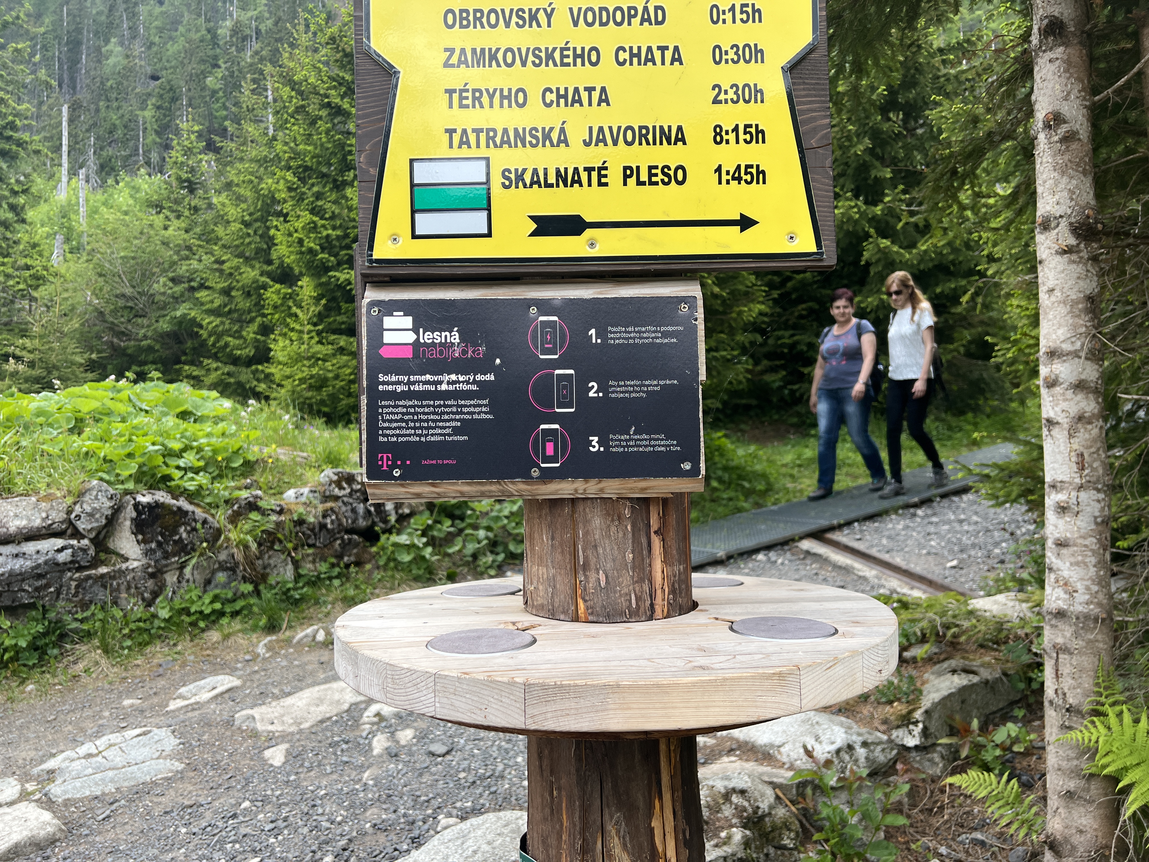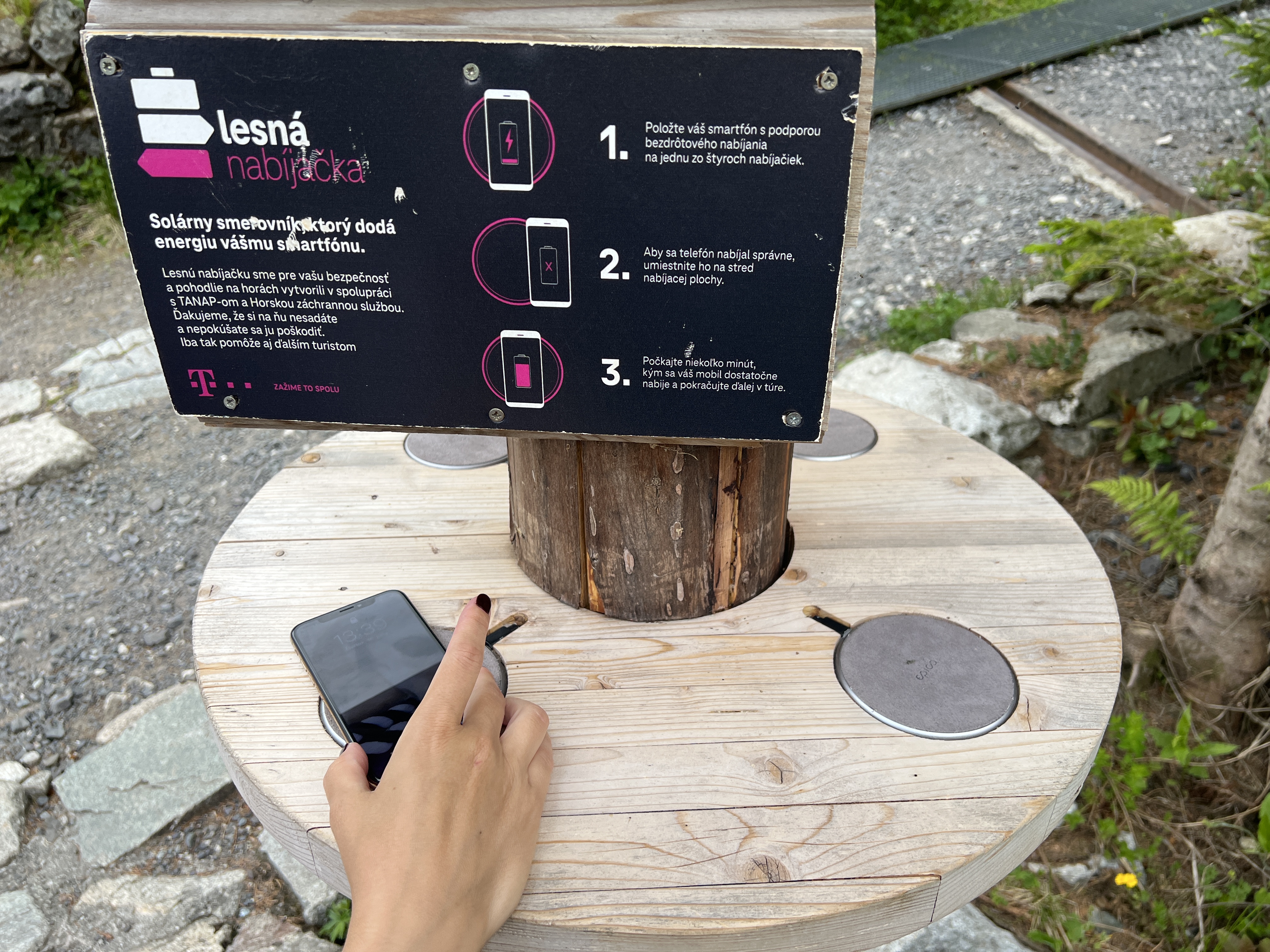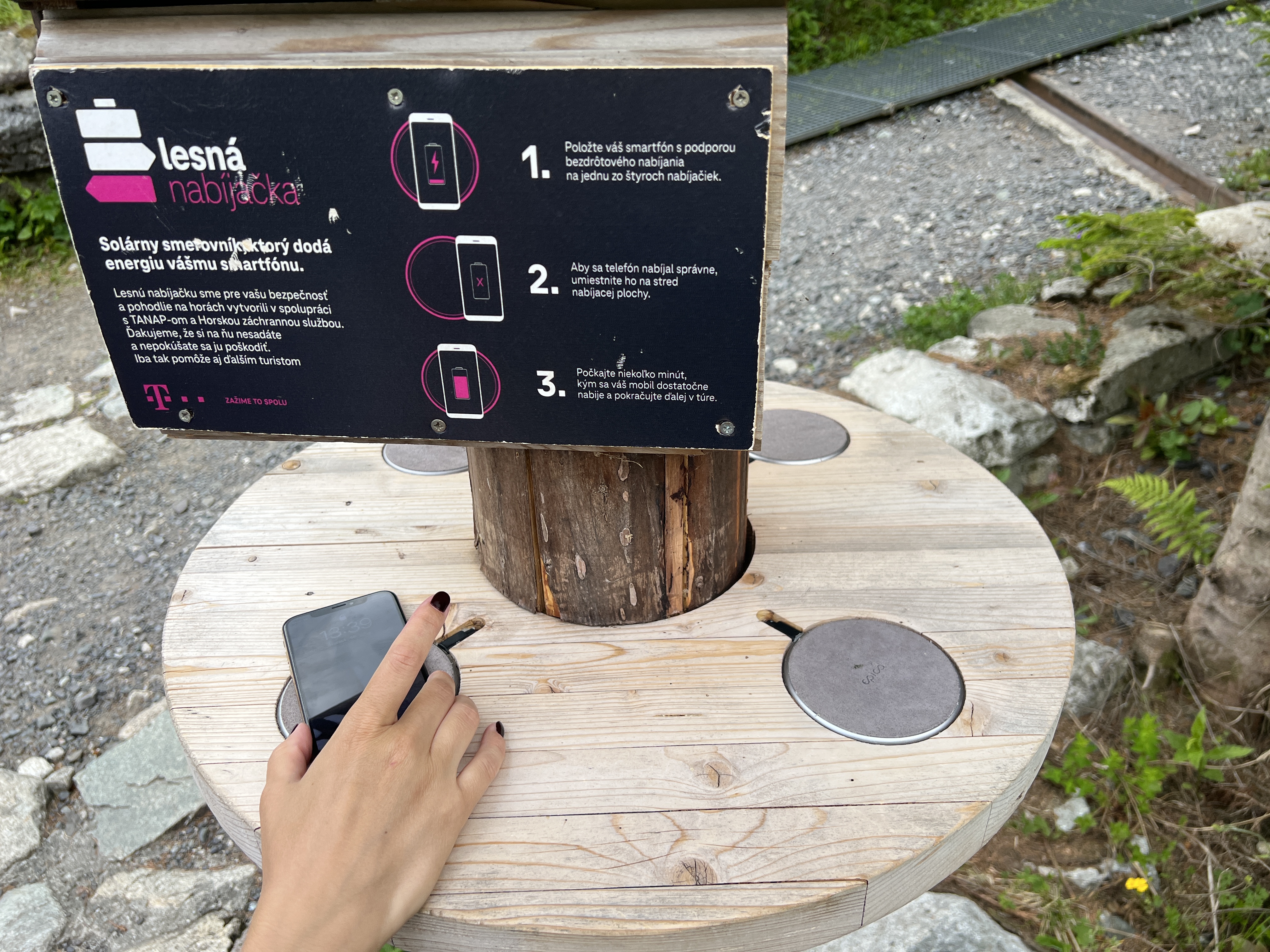 Opravdu užitečnou vychytávkou a to jak z hlediska bezpečí, tak i toho, že zkrátka potěší, že na ni narazíte, jsou bezdrátové lesní nabíječky. Ty umožňují nabíjet bezdrátově váš smartphone a to jak během klasické túry, tak samozřejmě i v krizových situacích, kdy si potřebujete například zavolat o pomoc.Tuto konkrétní jsme objevili při cestě z Hrebienku na Obrovský vodopád a nabízela čtveřici bezdrátových nabíječek, které zásobuje energií solární panel . Pokud jsem se správně díval, tak právě ony solární panely, které jsou umístěny na střeše turistického ukazatele, pod kterým je nabíječka, jsou tím jediným, co zásobuje elektřinou nabíjecí podložky. Pokud tedy nesvítí slunce, máte zkrátka smůlu, protože nějakou baterii pod stříškou s největší pravděpodobností nenajdete.