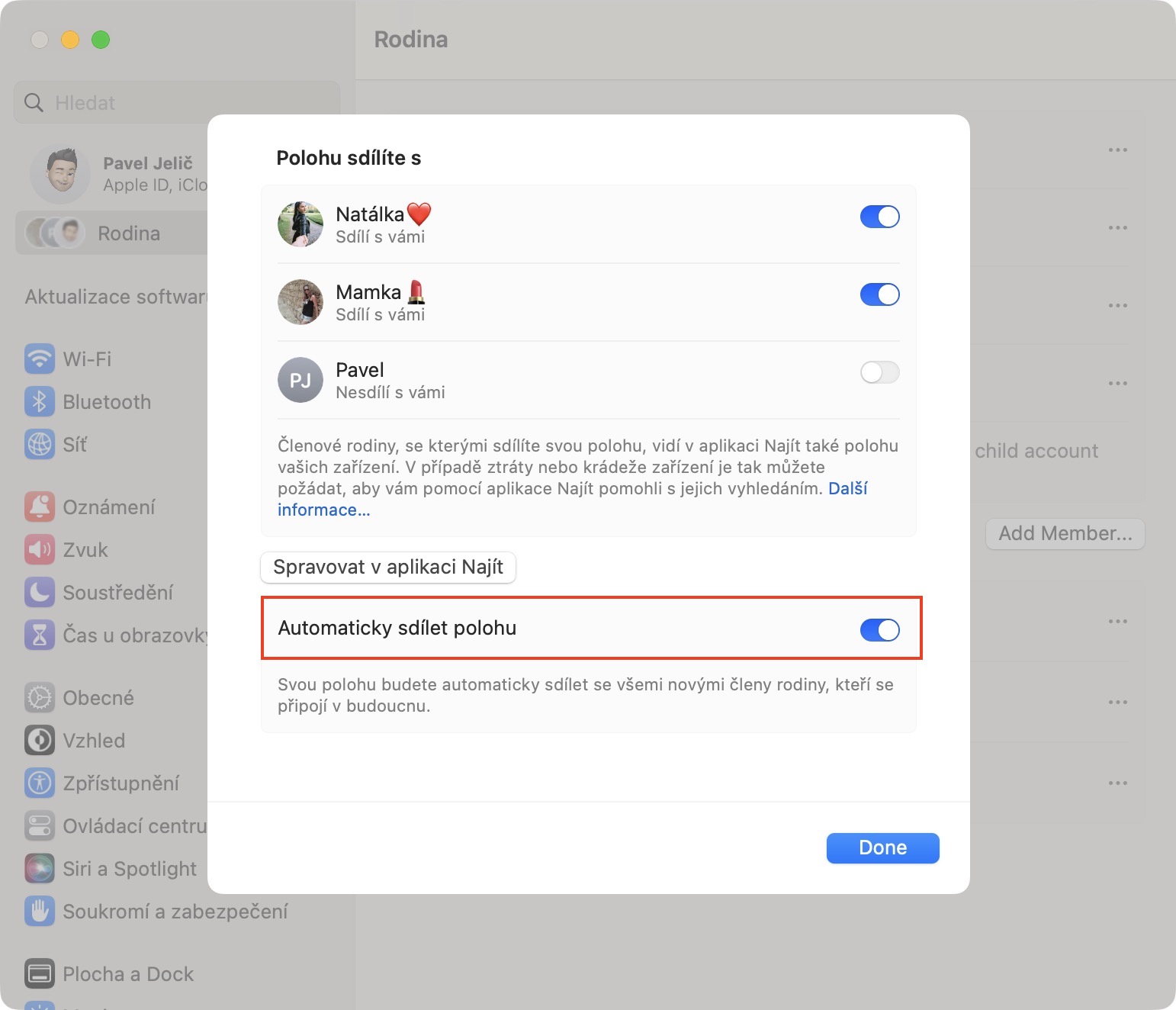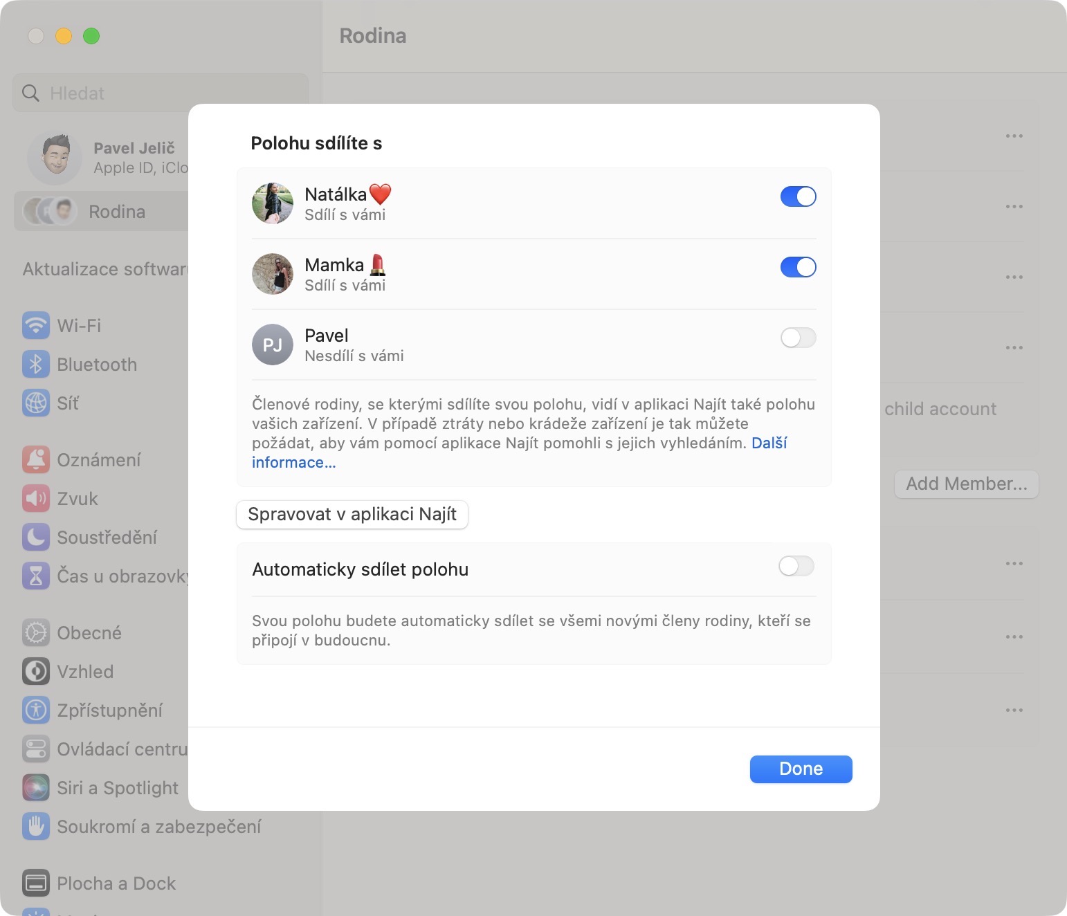 Jak bylo řečeno na předchozí stránce, tak s uživateli, kteří jsou součástí rodinného sdílení, můžete jednoduše sdílet polohu. Zatímco některým uživatelům tohle může vyhovovat, tak samozřejmě existují i takoví, kterým naopak ne. Kromě toho, že můžete zakázat sdílení vaší polohy jednotlivým uživatelům, tak můžete nastavit i to, aby se poloha automaticky nesdílela s budoucími členy rodiny. Stačí přejít do → Nastavení systému → Rodina, kde dole rozklikněte Poloha, a poté v novém okně deaktivujte Automaticky sdílet polohu.