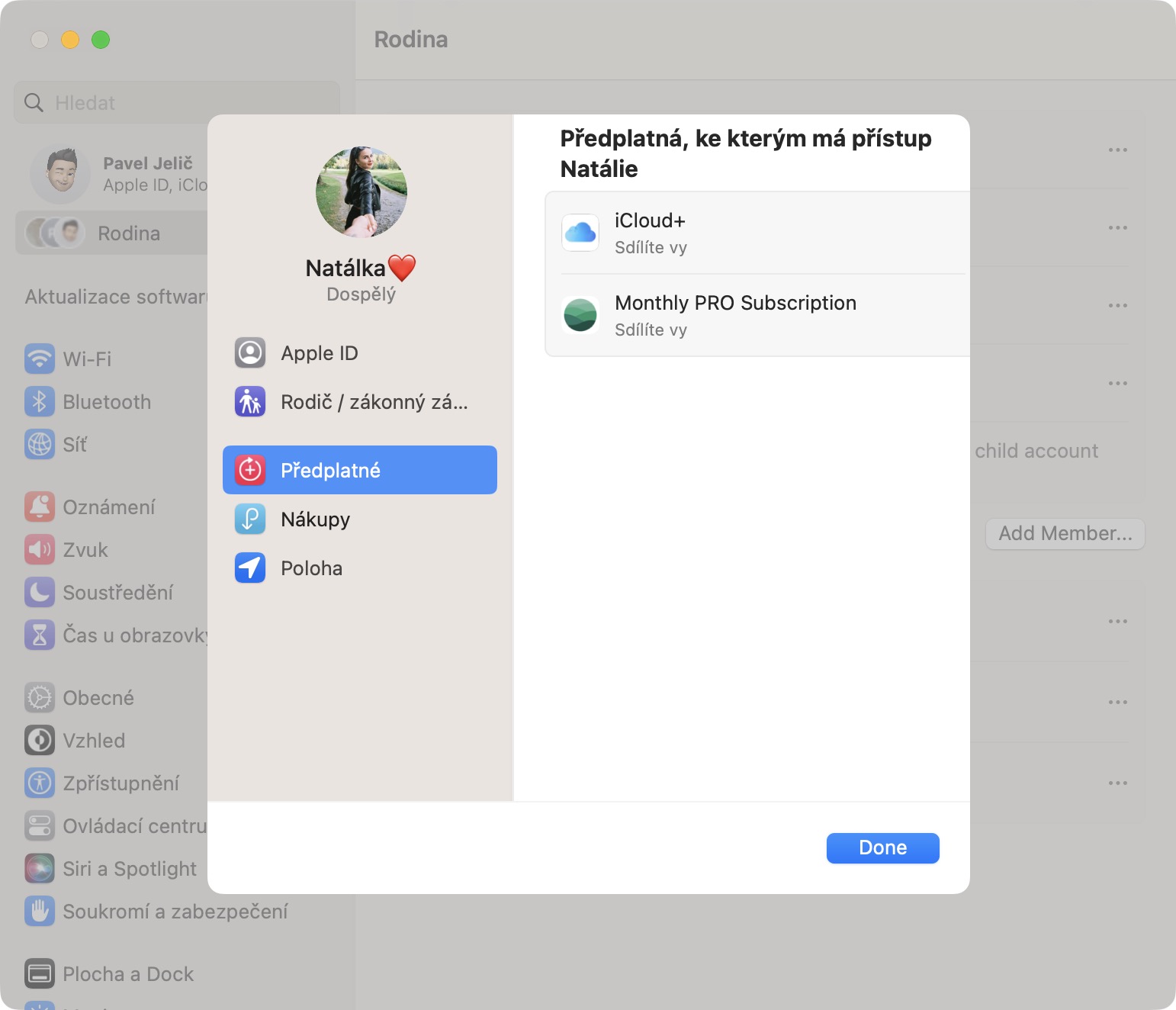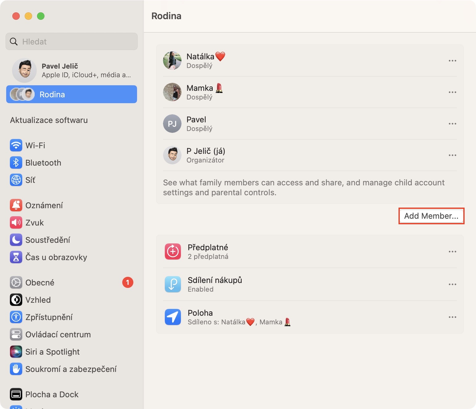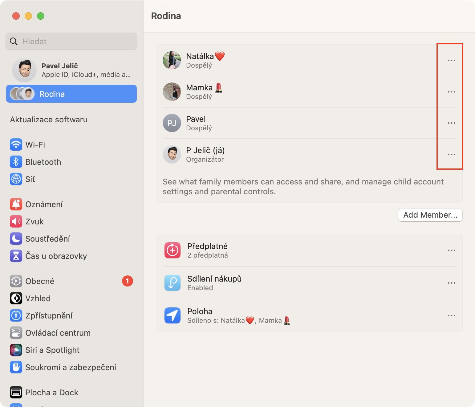 V rodinném sdílení si u každého uživatele můžete přizpůsobit několik možností. Kromě toho, že si můžete zobrazit Apple ID člena, což se může v některých případech hodit, tak je možné také nastavit pravomoce rodiče či zákonného zástupce, nastavit sdílená předplatná a aplikace, společně se sdílením polohy. Pokud byste chtěli tato nastavení u člena rodiny změnit, přejděte do → Nastavení systému → Rodina, kde u dotyčného klepněte napravo na ikonu tří teček.