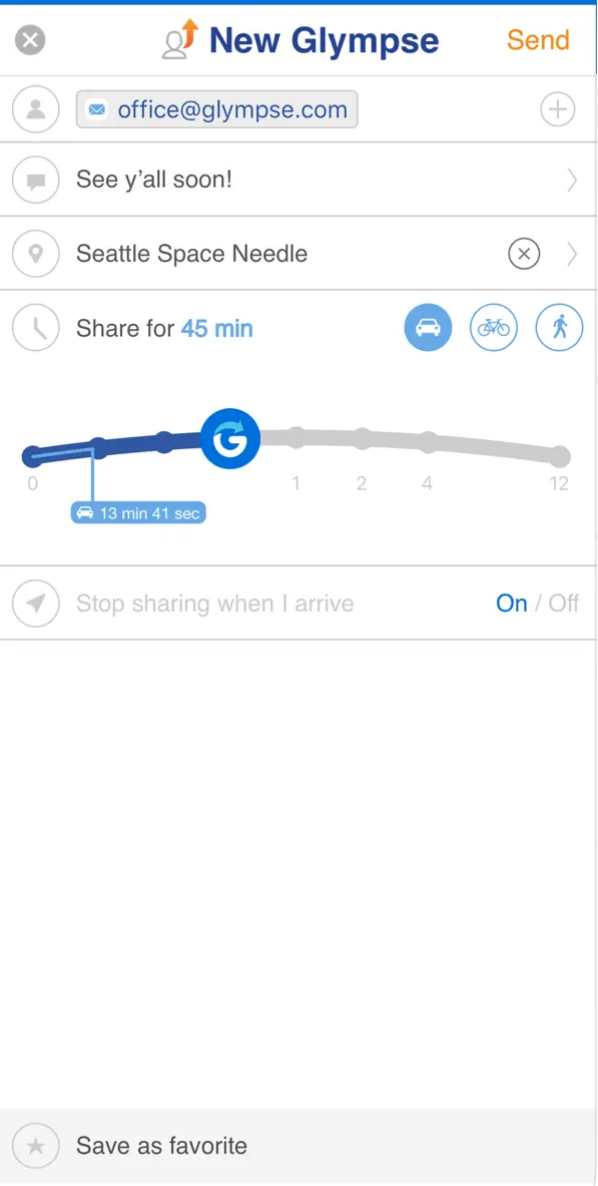 Pokud na vás vaši blízcí neustále naléhají, abyste o sobě alespoň při přejezdech mezi jednotlivými destinacemi dávali vědět, a vy máte strach, že je opět zapomenete informovat o bezpečném přijezdu do cíle, můžete jim v reálném čase nasdílet svou polohu pomocí aplikace Glympse. Můžete nastavit délku a další parametry sdílení, a druhá strana vás může sledovat přes aplikaci v iOS či Android zařízení, ale také v rozhraní webového prohlížeče.