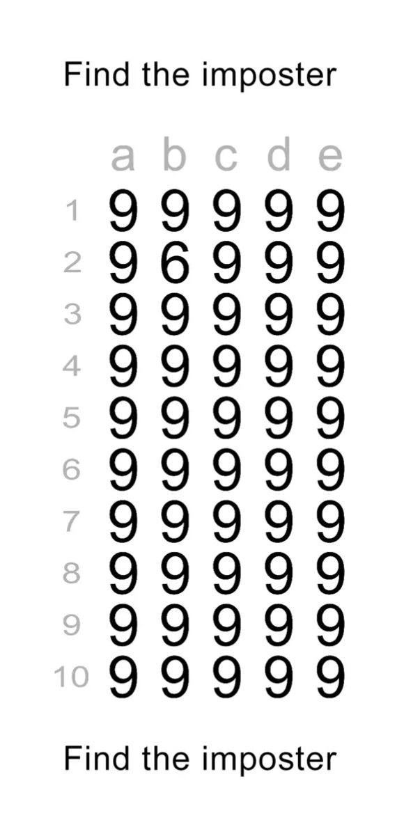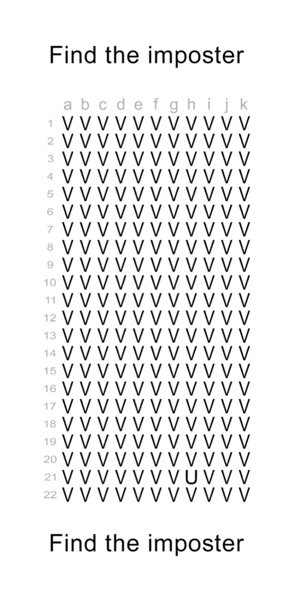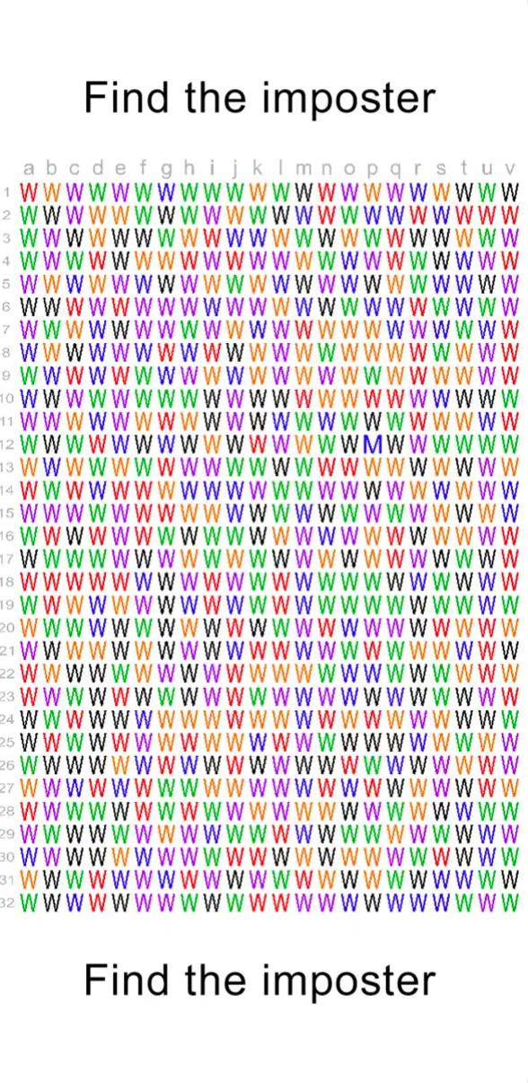Chcete řádně potrápit své mozkové závity i schopnost vnímání a postřehu? Vyzkoušejte hru Imposter Hidden Letter Game. Mezi mnoha dalšími se schovává jeden jediný znak, který sem nepatří. Vaším úkolem bude jej najít v co možná nejkratším čase. S každou další úrovní stoupá náročnost této hry.