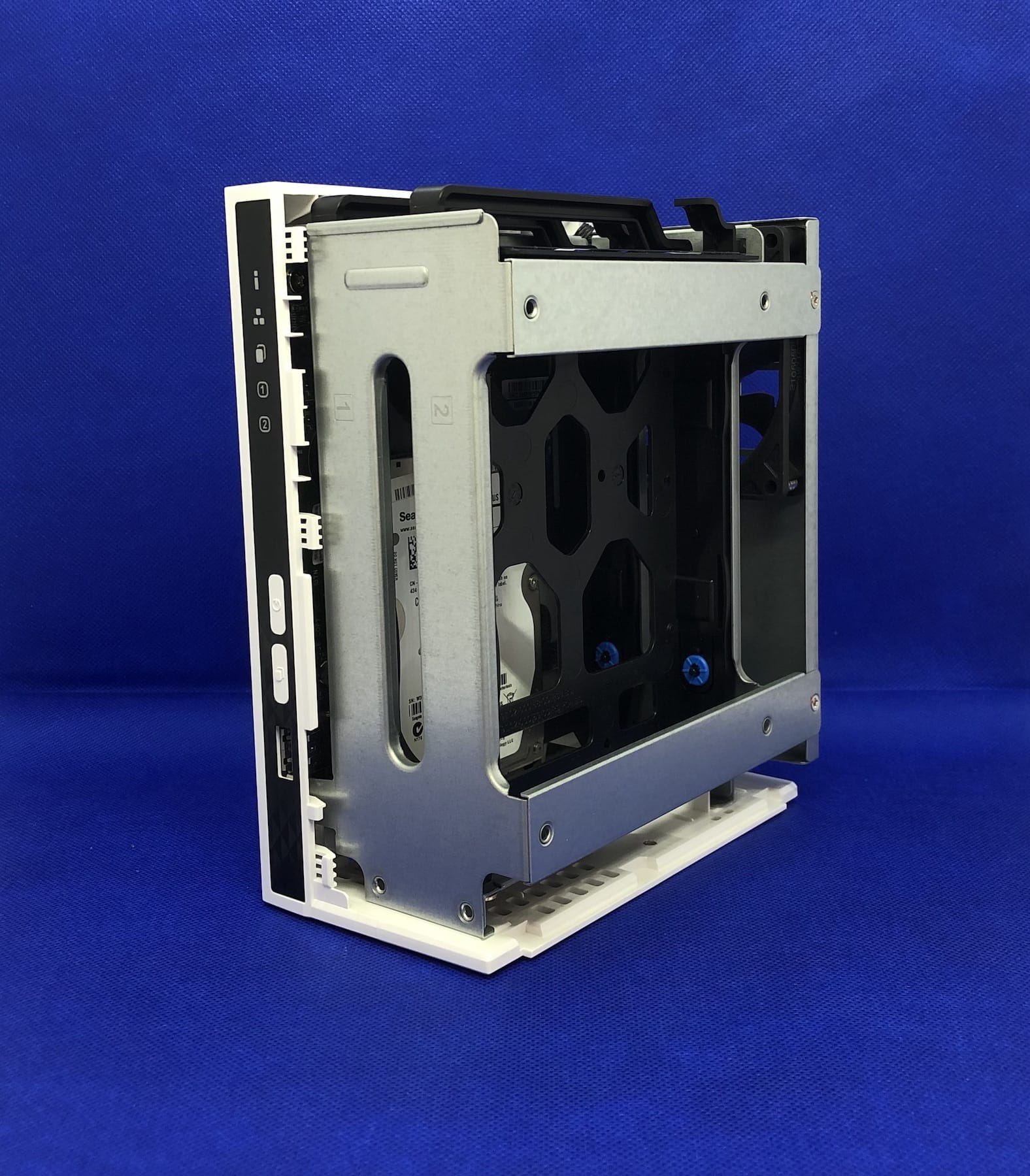 Nyní už záleží na tom, jaké disky budeme vlastně zapojovat. Pokud bychom měli v plánu použít 3,5“ HDD, pak se jejich uchycením prakticky nemusíme nikterak obtěžovat. Stačí totiž z hot-swap rámečku odcvaknout boční úchytky, vložit disk dovnitř a úchytky nazpět zacvaknout. V případě 2,5“ disků se už neobejdeme bez šroubků. Ty jsou samozřejmě součástí balení (i pro 3,5″ disky). Disk si tedy nachystáme tak, abychom jej mohli přichytit a s pomocí křížového šroubováku (PH1) spojíme úložiště s rámečkem. Posléze stačí rámečky zapojit, nasadit zpátky kryt NASu a konečně se pustit do toho nejdůležitějšího.