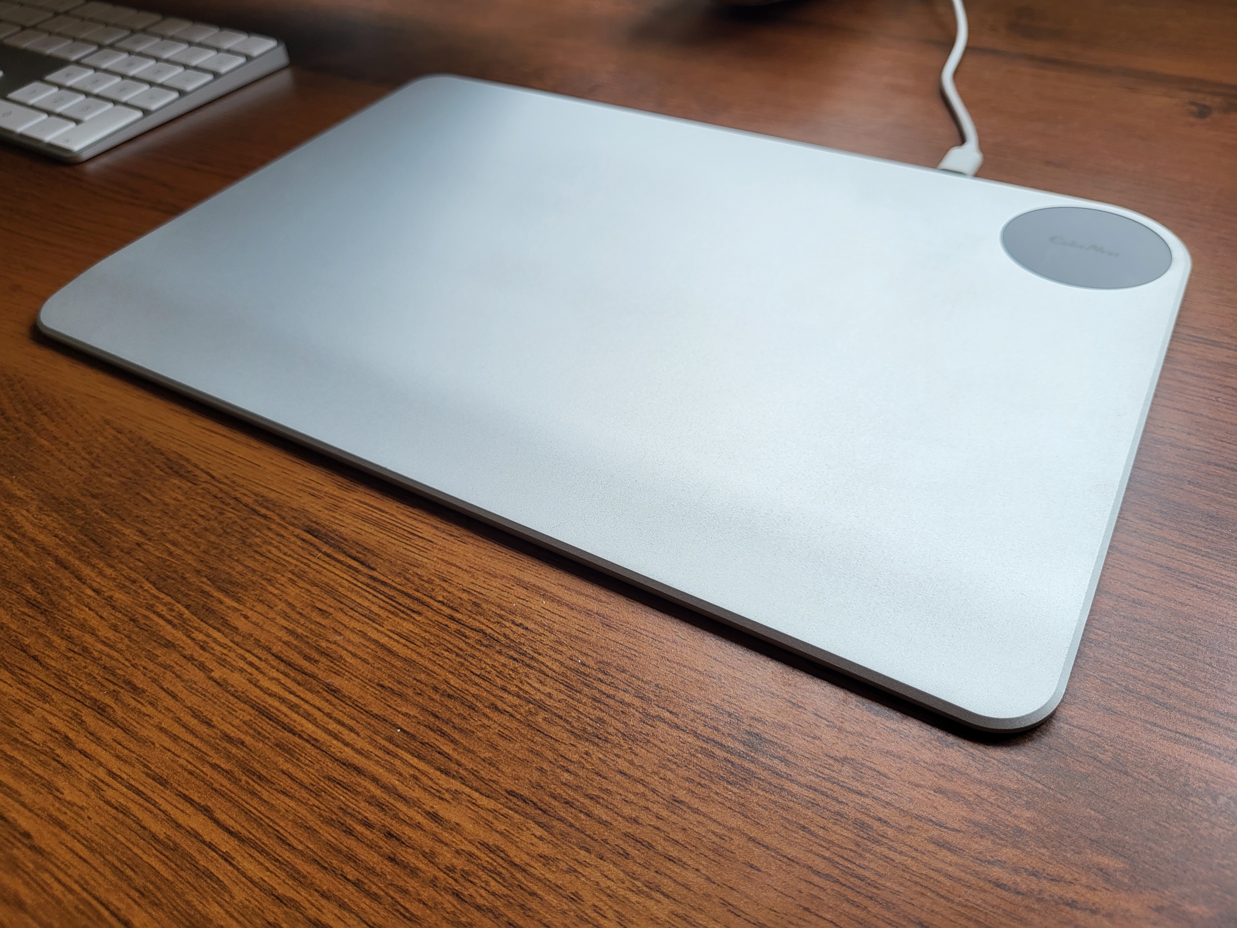 Celá horní plocha, tedy s výjimkou pro nabíjecí prostor, je vyrobena z kvalitního broušeného hliníku. Spodní strana je poté pogumovaná, aby podložka neklouzala po stole. V oblasti nabíjecí podložky je pak USB-C konektor, kterým samozřejmě dodáte podložce patřičnou šťávu, kterou poté může předávat dál. Nechybí ani signalizační LED.