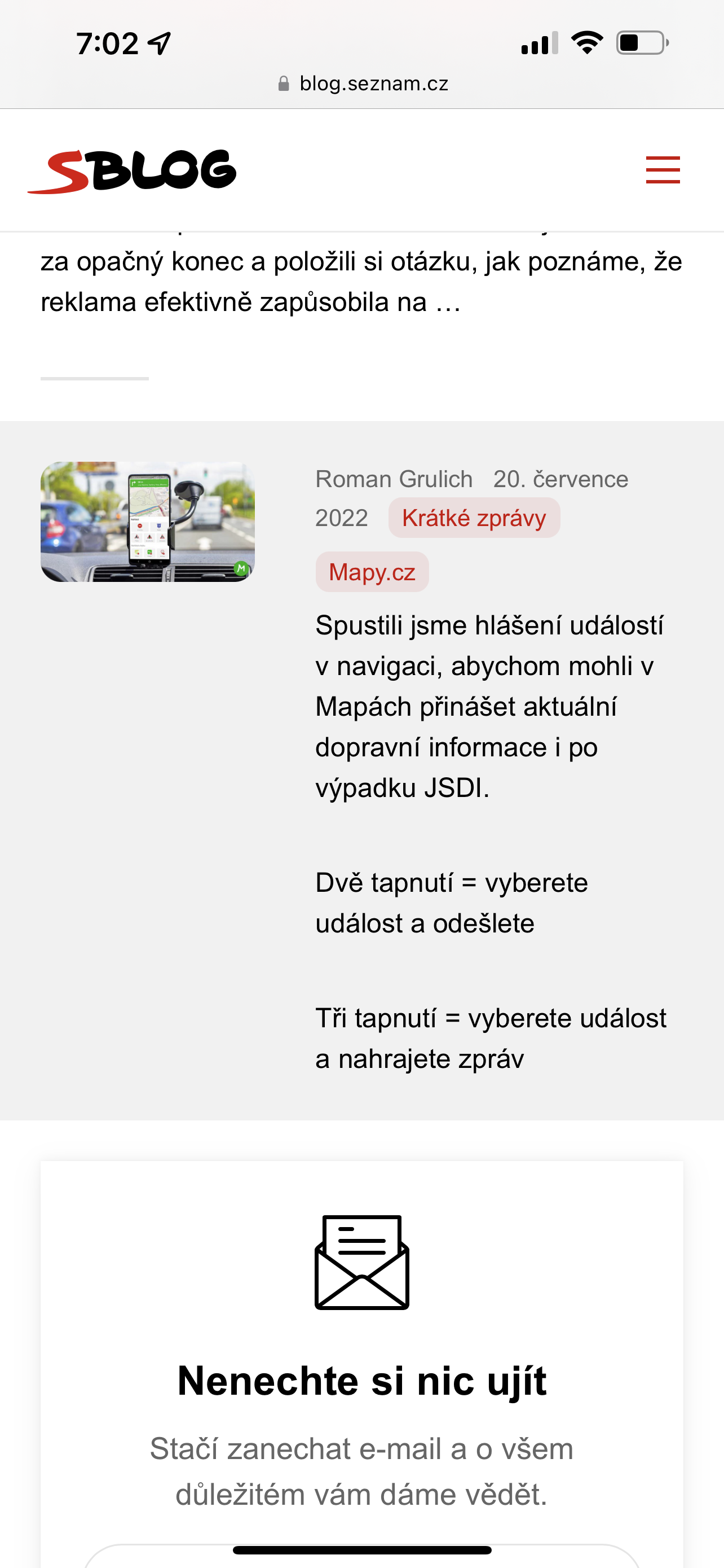 Se systémem nahlašování nenadálých dopravních situací přišlo jako první Waze, které se díky tomu těšilo v minulosti skutečně velké celosvětové oblibě. Později jej však koupil Google, který následně nahlašovací systém implementoval do rozšířenějších Google Maps, kde jej i nadále rozšiřuje. A jelikož se jedná o prvek, který dokáže uživatelům cestování výrazně usnadnit, rozhodly se pro jeho nasazení i Mapy.cz. Novinka je dostupná konkrétně od verze aplikace 6.22.0, přičemž k dispozici je buď možnost nahlášení některé z přednastavených událostí, nebo zaslání hlasových zpráv, ve kterých danou situaci popíšete.