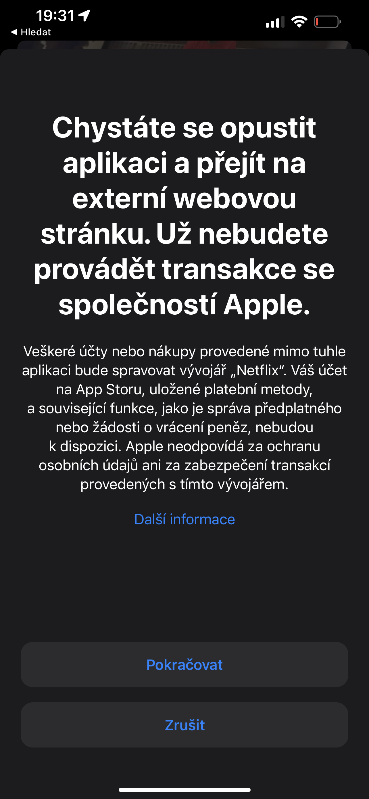 Začátkem letošního roku začal Apple umožňovat některým typům aplikací přidávat tlačítka, které uživatele převedou na jejich weby a na těch si tak mohou uživatelé následně zřídit účty pro předplatné a tedy i přihlášení do mobilní aplikace. Důvodem k zavedení této možnosti byla údajně řada antimonopolních vyšetřování, která se točila mimo jiné právě kvůli nesmyslnému bránění Applu využít jablíčkářům jiné cesty předplacení služby než přes jeho platební systémy, přestože jiné možnosti k dispozici byly. Ačkoliv zatím tuto možnost nemohou nasadit všichni vývojáři, Netflix spadá do kategorie, u které je řešení ve formě tlačítka pro přesměrování na web služeb možné a tudíž možnost využil.