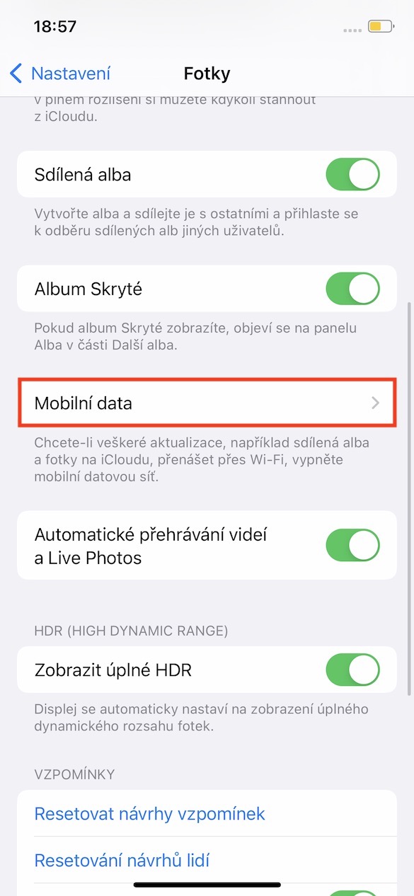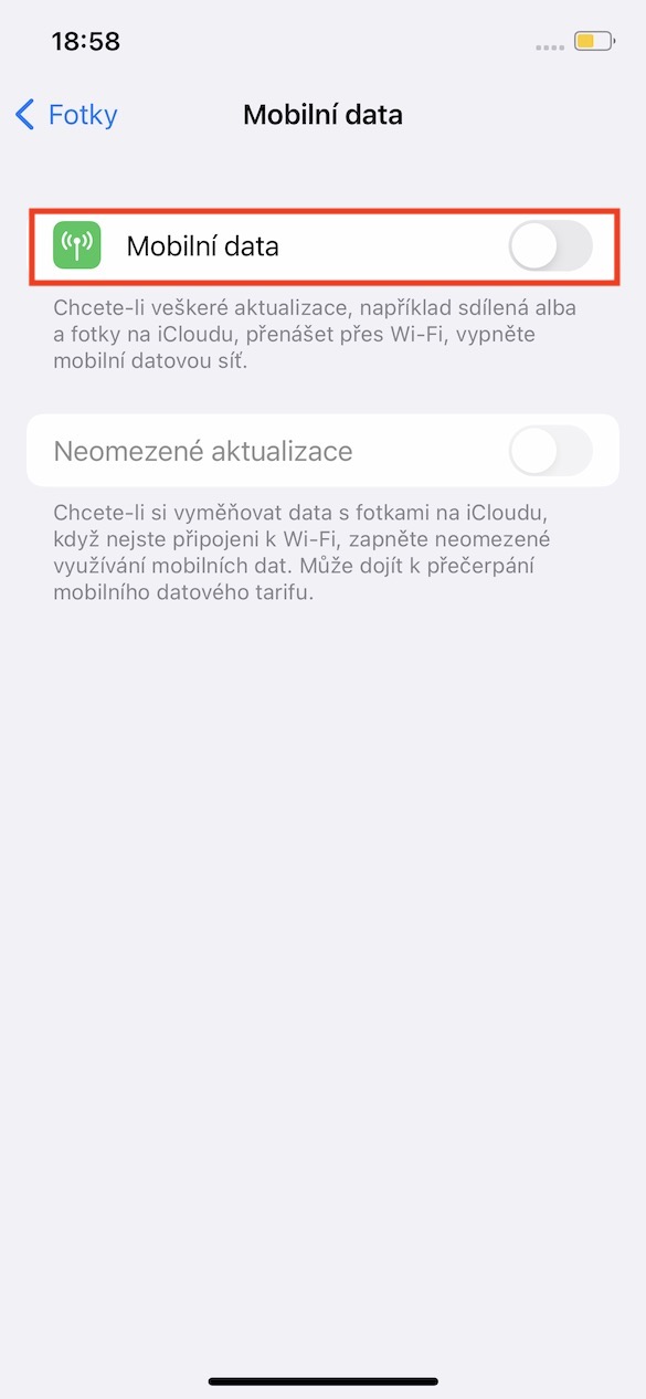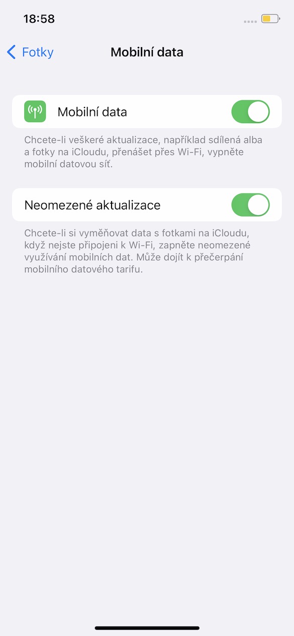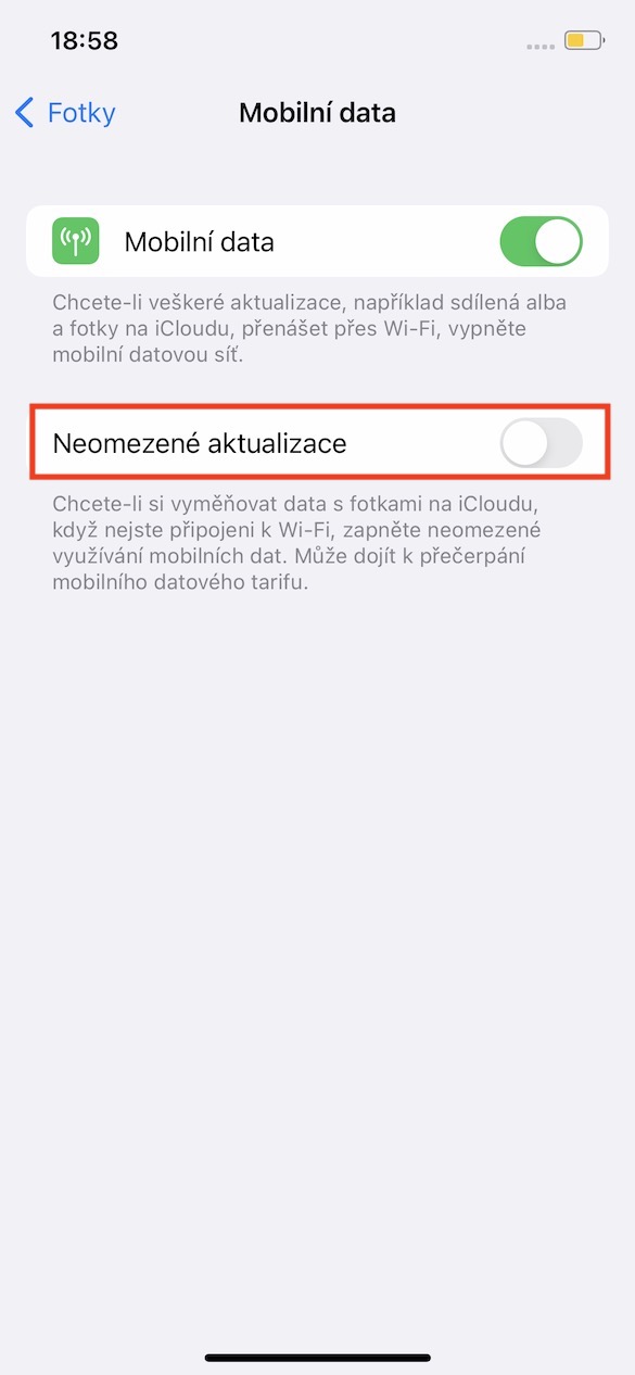 Patříte mezi jedince, kteří mají neomezená data? Popřípadě máte doma nestabilní Wi-Fi a raději využíváte mobilní data? Pokud ano, tak si můžete nastavit, aby se veškeré fotografie synchronizovaly na iCloud i skrze mobilní data – ve výchozím nastavení je tato funkce zakázána. Pro aktivaci tedy přejděte do Nastavení → Fotky → Mobilní data, kde aktivujte Mobilní data, a poté také Neomezené aktualizace. Následně už vám bude synchronizace fungovat i při využití mobilních dat.