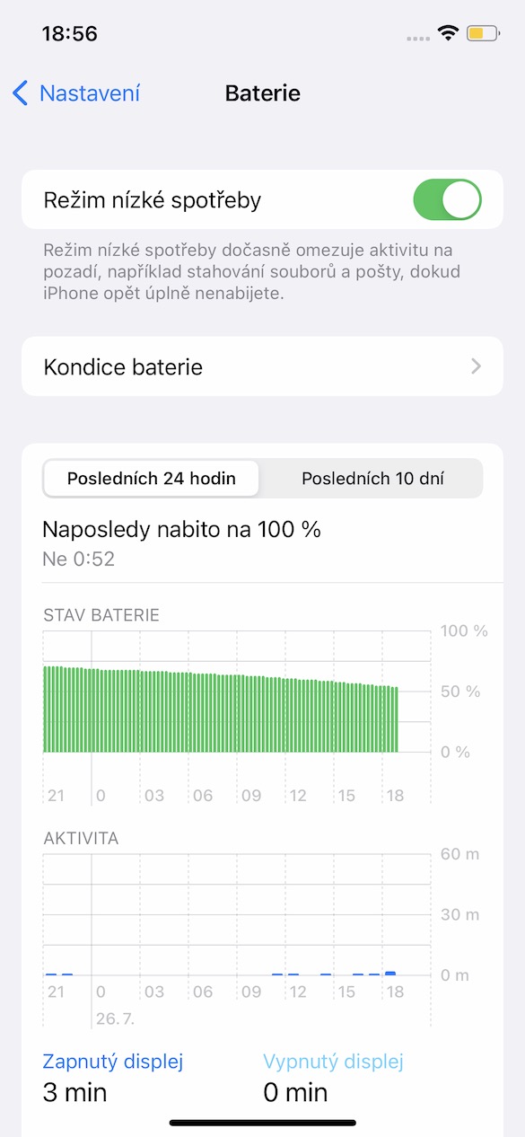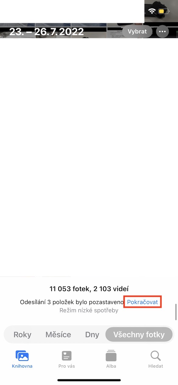 Aby se mohla synchronizace fotek na iCloud spustit, tak je nutné, aby nebyl aktivní režim nízké spotřeby baterie, a to vzhledem k tomu, že se jedná o relativně náročný proces na baterii. Pro spuštění synchronizace je nutné tedy úsporný režim vypnout, a to buď skrze ovládací centrum, nebo v Nastavení → Baterie. Popřípadě můžete vynutit synchronizaci i při aktivním režimu nízké spotřeby, stačí ve Fotkách sjet úplně dolů a klepnout na Pokračovat.