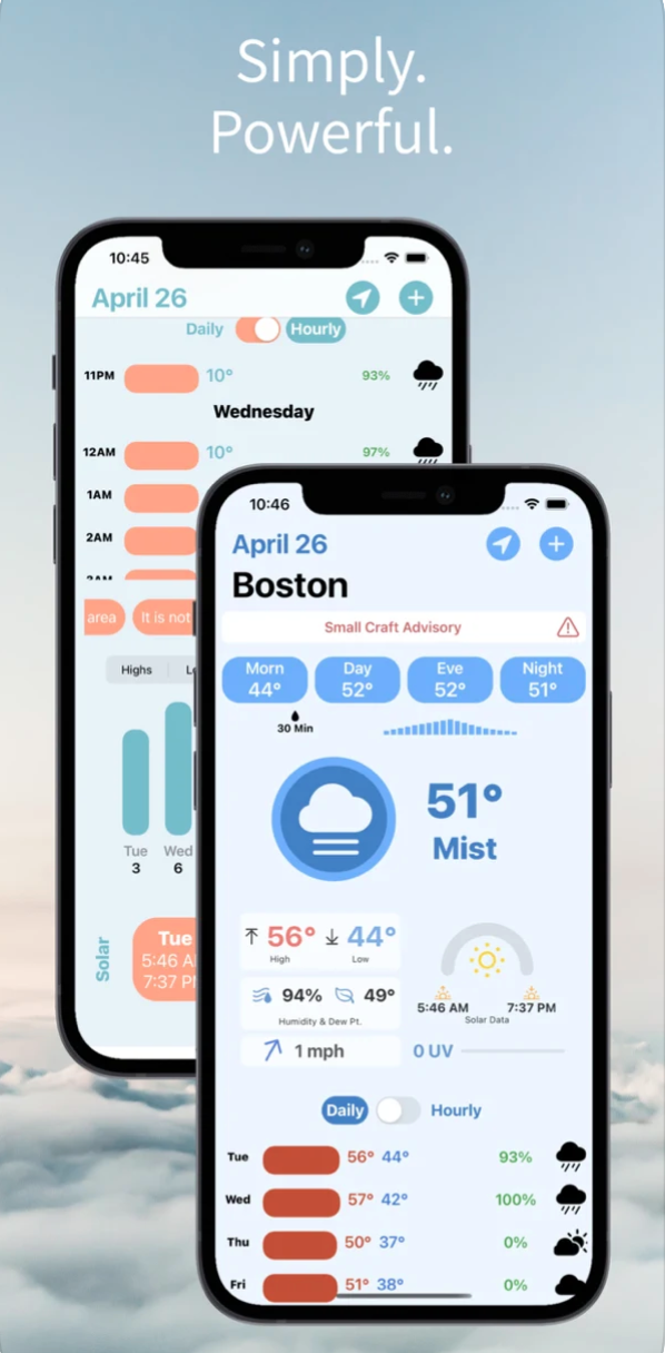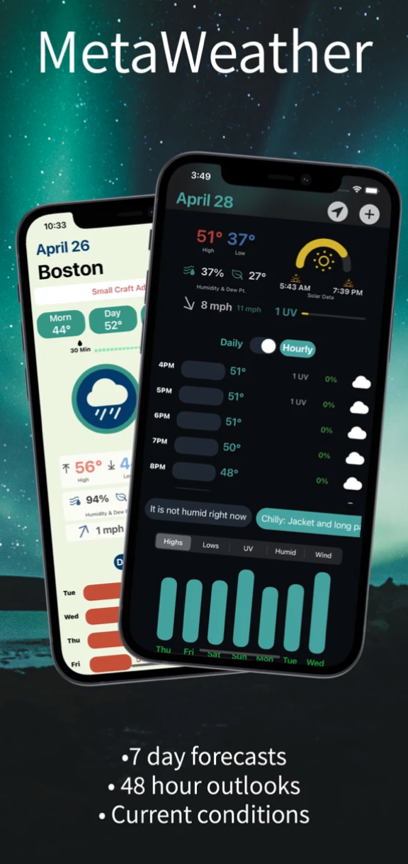 MetaWeather je zajímvá aplikace pro předpověď počasí, která vám nabízí možnost zobrazení trendů, předpovědí na nejbližší hodiny i dny, upozornění, nebo třeba informace o východu a západu slunce a další údaje. Kromě toho nabízí také spoustu pěkných a přizpůsobitelných widgetů na ploch vašeho iPhonu.