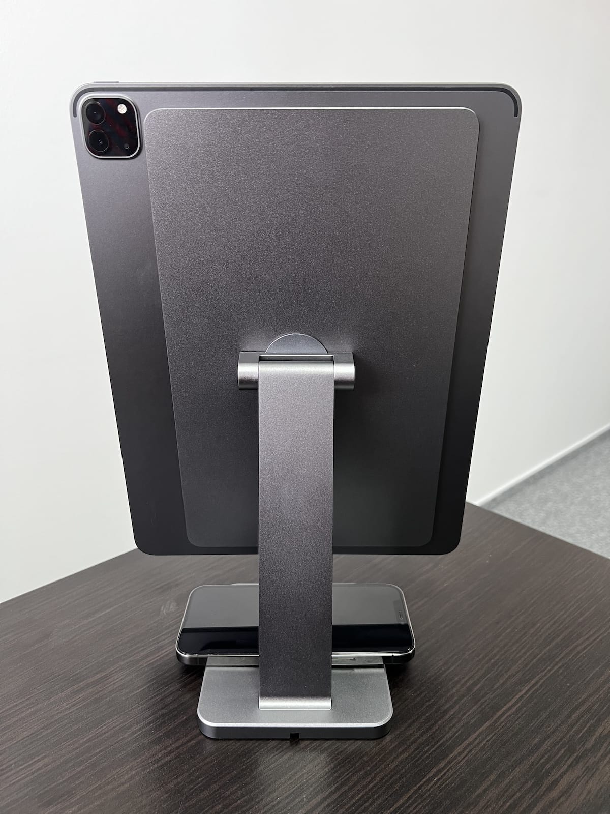 Stojan jako takový je vyroben z hliníku, jehož odstín se velmi blízce podobá vesmírně šedému provedení od Applu. Vzhledem k použitému materiálu proto asi nepřekvapí, že je vcelku robustní a díky široké základně taktéž stabilní. Přímo o stabilitu se zároveň stará i gumová protiskluzová podložka na spodní straně. Designové tělo obsahuje silné magnety sloužící k uchycení iPadu. Možná vás v tomto bodě může napadnout, zda nemůže stojan náš tablet kupříkladu poškrábat. Přeci jen, jde o hliník na hliník. Povrch stojanu je naštěstí ošetřen speciální ochrannou vrstvou, díky čemuž se ničeho takového obávat nemusíme. Za zmínku také ještě stojí kloub v zadní části tabletu, který umožňuje 360° rotaci pro tablet v pozici režimu portrét nebo krajina a 180° rotaci k nastavení ideálního sklonu.