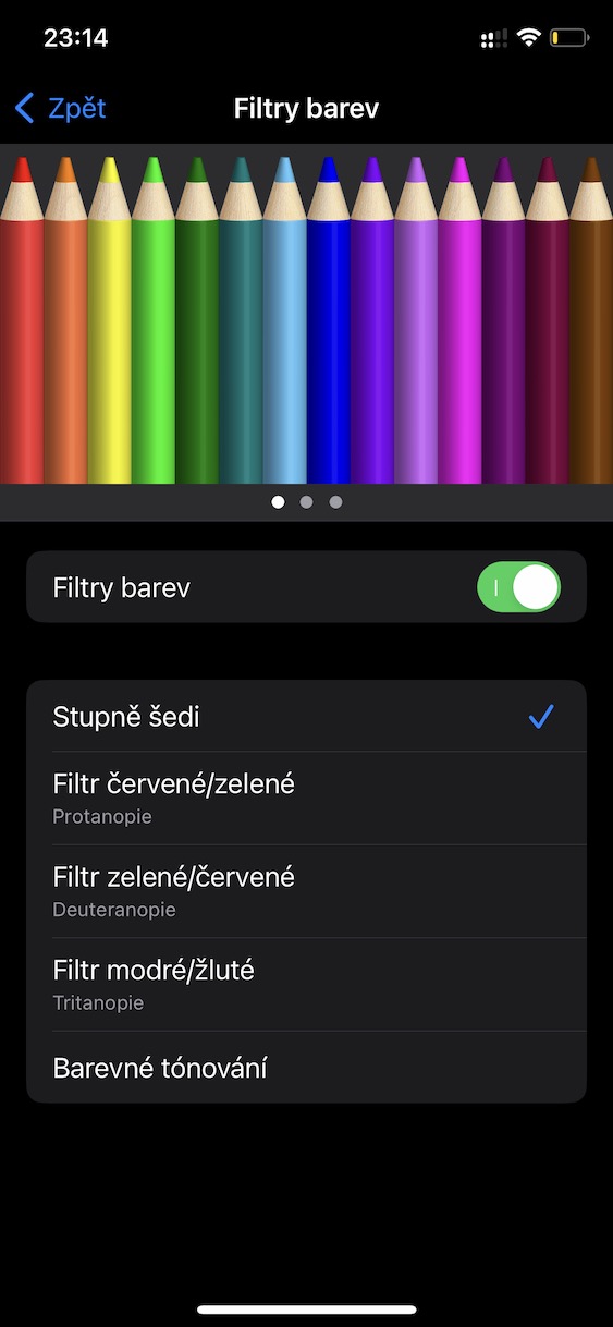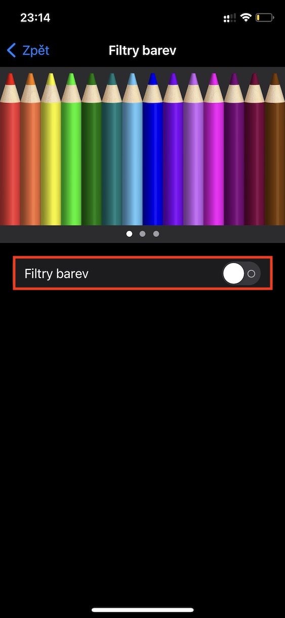 - Na další stránce pak pomocí přepínače aktivujte Filtry barev.
