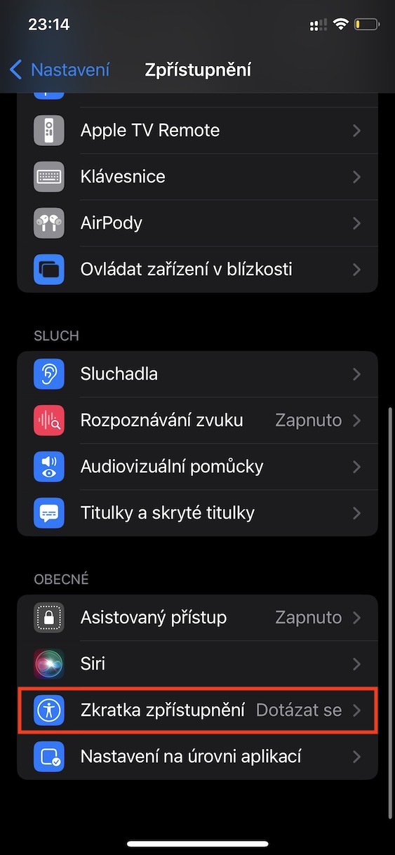 - Následně úplně dole v kategorii Obecné klepněte na Zkratka zpřístupnění.