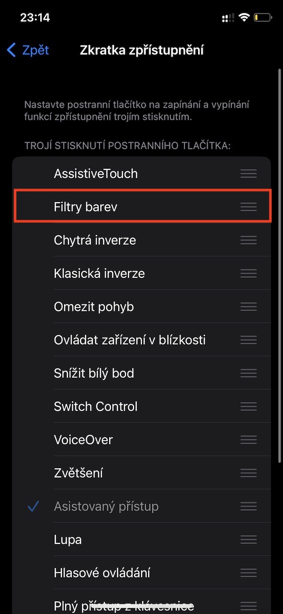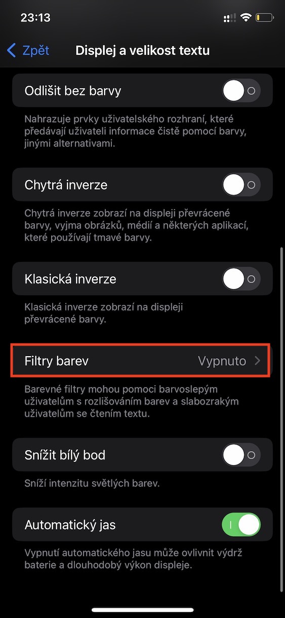 - Nakonec sjeďte níže ke kategorii Zpřístupnění a klepnutím zaškrtněte Filtry barev.