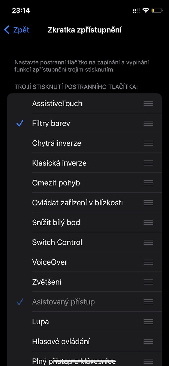 Filtr odstínů šedi je možné aktivovat také trojitým stisknutím tlačítka. Na iPhonech s Face ID se jedná o boční tlačítko, na iPhonech s Touch ID pak o tlačítko plochy. Postup pro aktivaci je následující:
