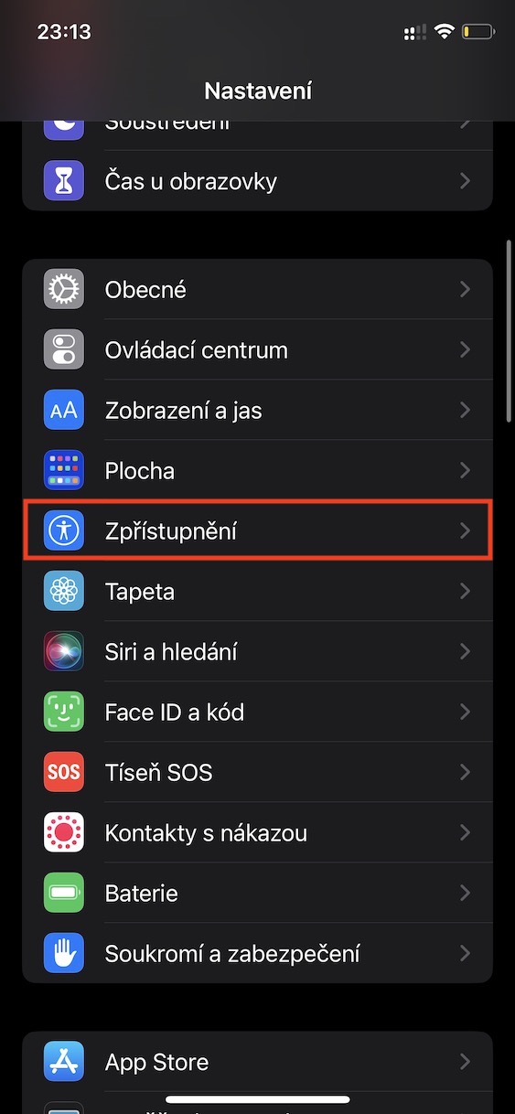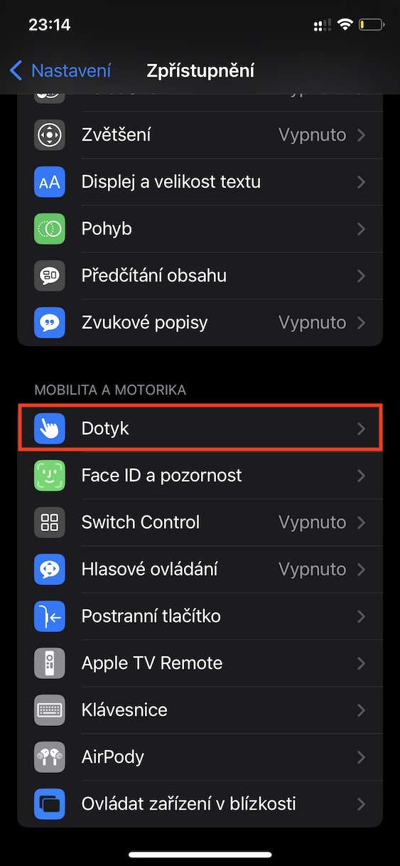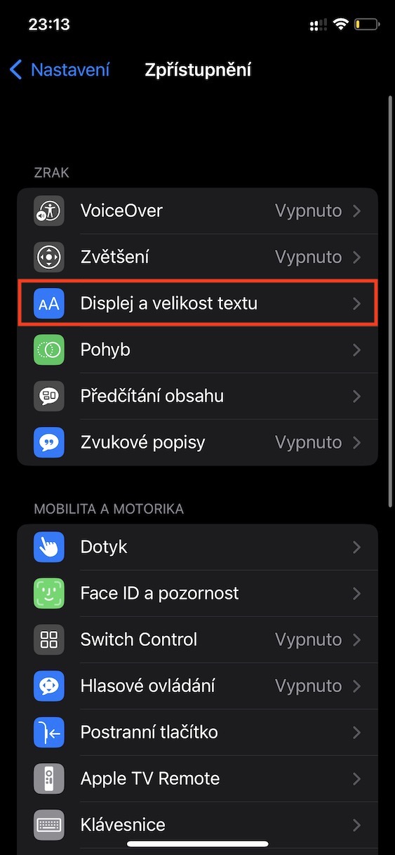 - Následně zde v kategorii Zrak rozklikněte sekci Displej a velikost textu.