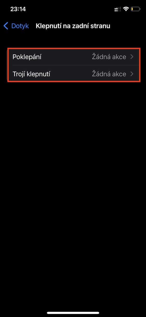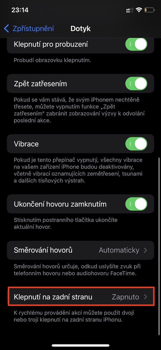 - Zde pak sjeďte úplně dolů a rozklikněte kolonku Klepnutí na zadní stranu.