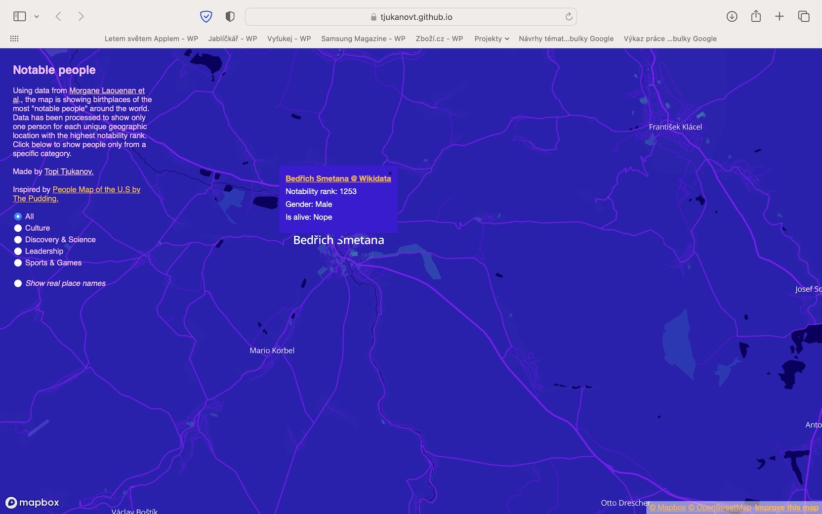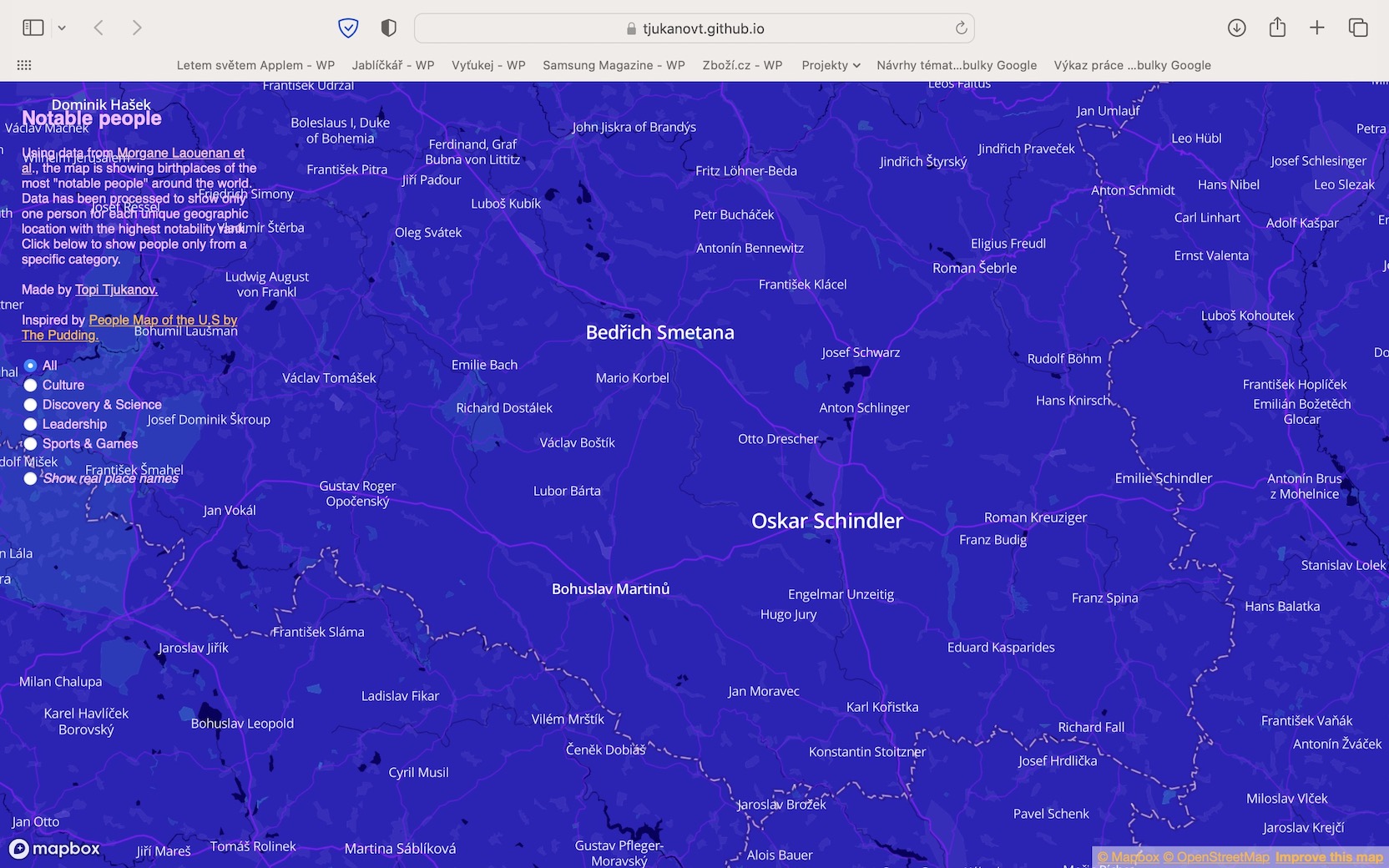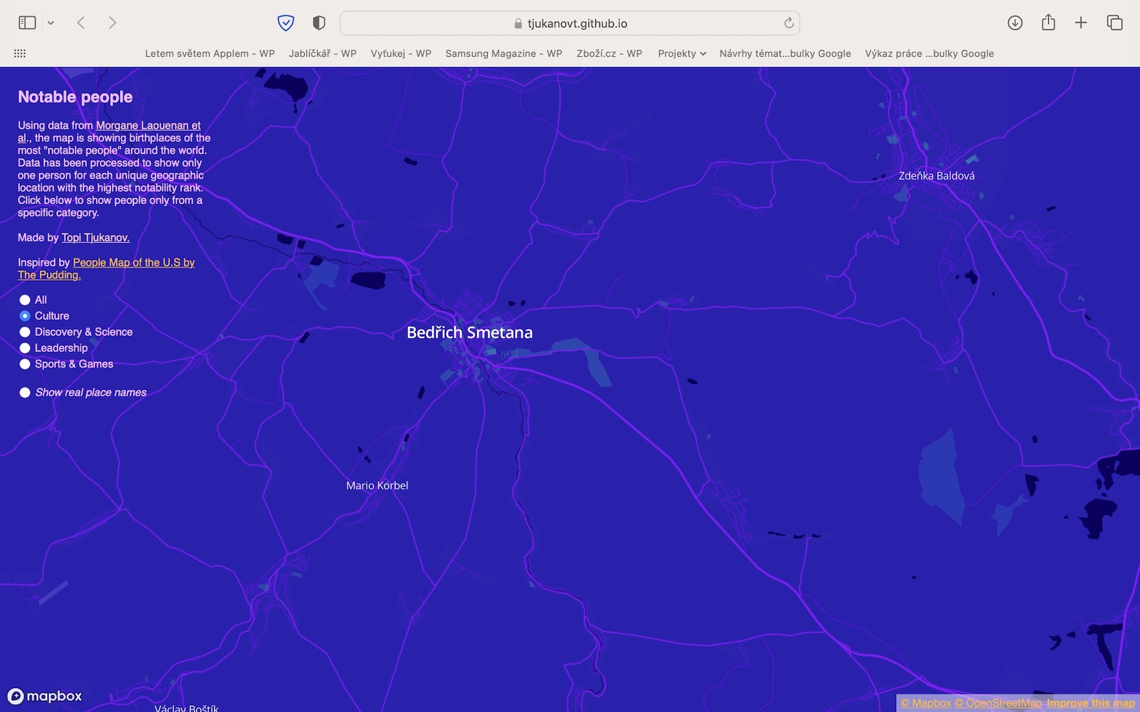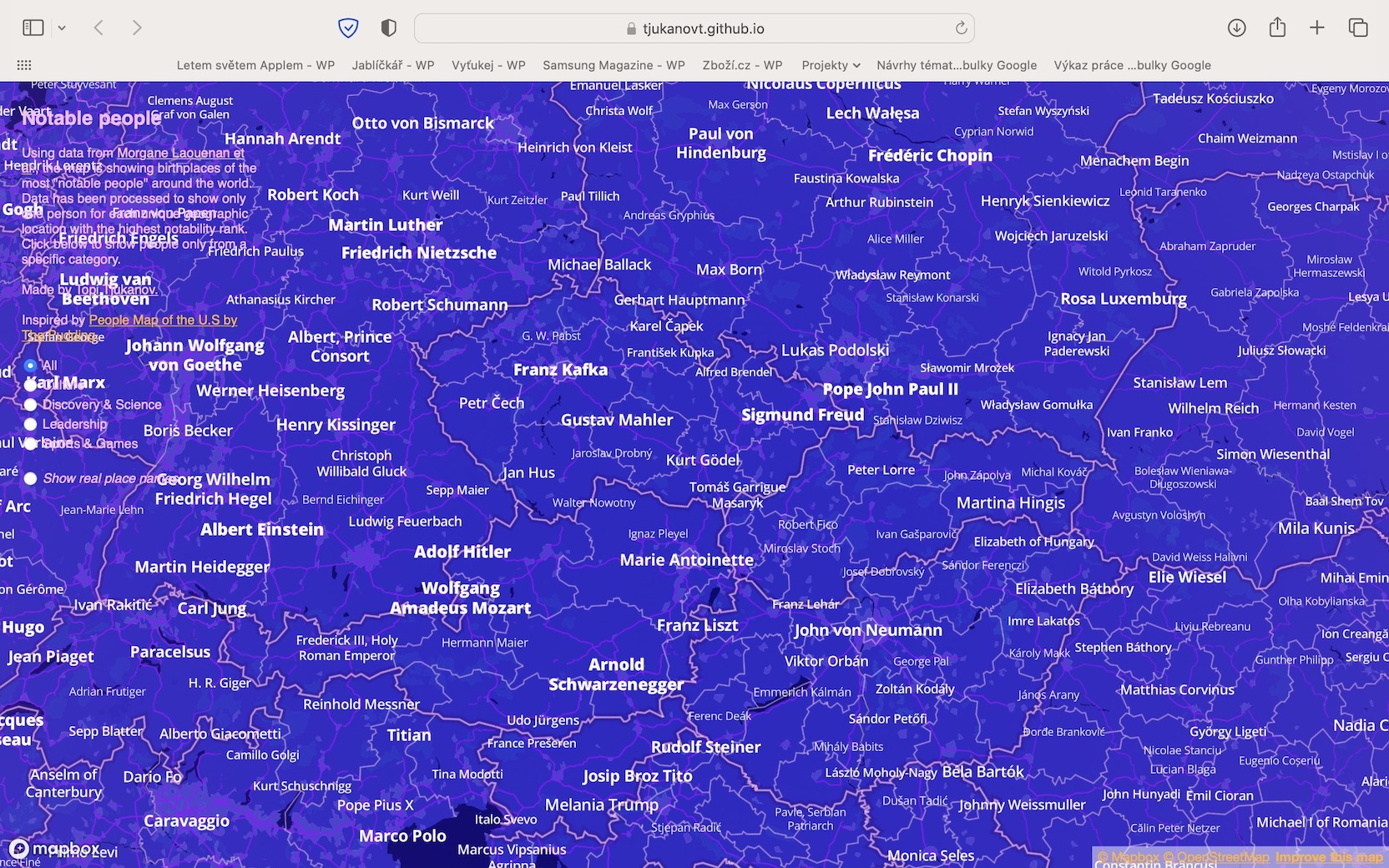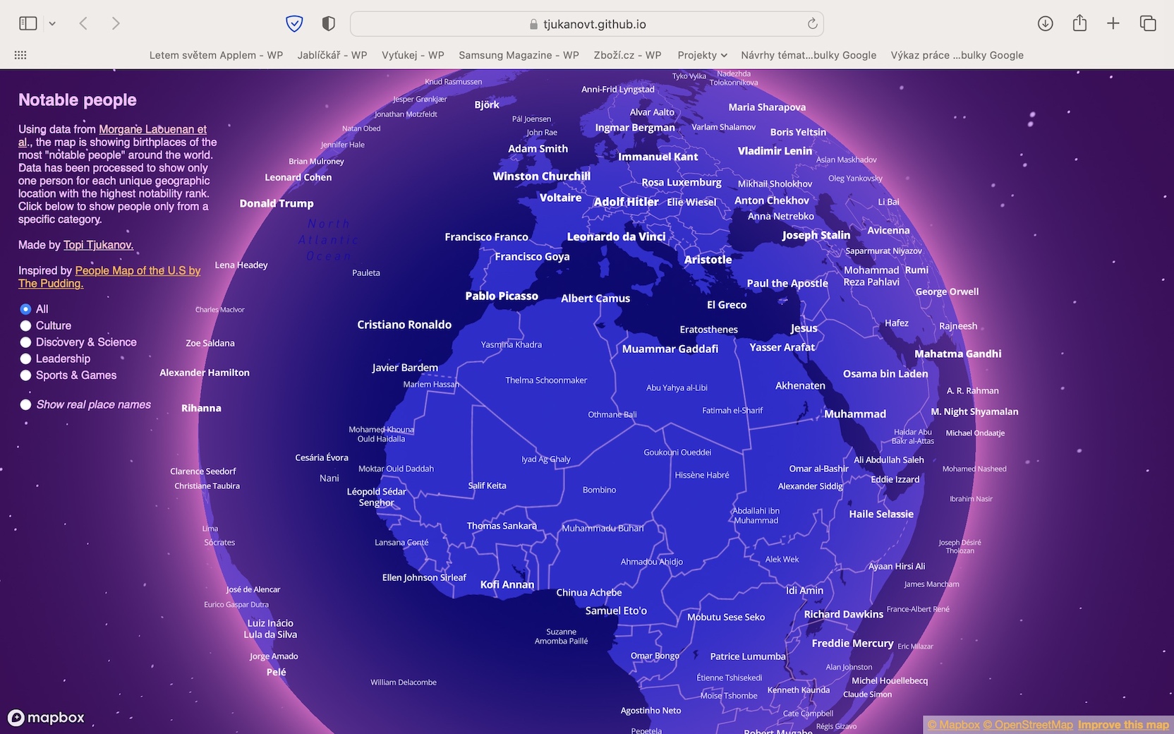 Co se týče ovládání aplikace Notable People, není to nic složitého. Na levé straně si můžete nastavit, zdali chcete zobrazit nejvýznamnějšího jedince ze všech směrů, anebo zdali se má jednat o kulturního představitele, vědce, vůdce či sportovce. Jediný problém je v tom, že bohužel na mapě nemůžete jednotlivá místa vyhledávat – vždy je tedy musíte jednoduše najít. Každopádně si můžete nalevo aktivovat možnost Show real place names s tím, že následně se vám namísto jmen objeví jména států a jednotlivých měst. Jakmile to své najdete, stačí se zase jednoduše přepnout na zobrazení jmen z vybraného směru. Za aplikací Notable People stojí Topi Tjukanov a rozhodně se jedná o velmi zajímavý počin, který doporučuji zkontrolovat – možná se dozvíte něco, co jste doposud nevěděli.