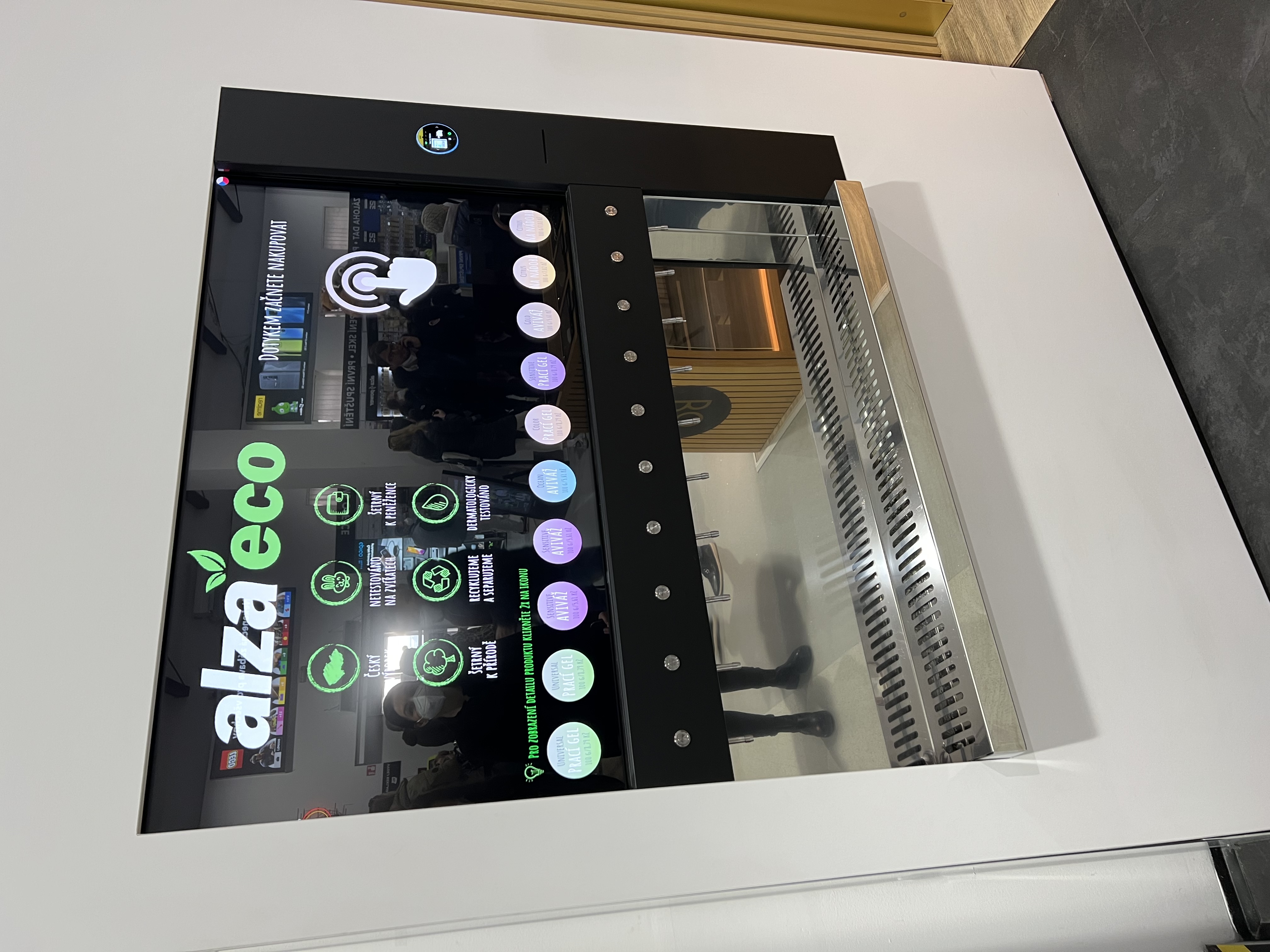 Komerční sdělení: Alza.cz v holešovickém showroomu nainstalovala samoobslužný automat na bezobalový prodej čisticích prostředků. Návštěvníci mohou zakoupit ekologickou drogerii do přinesených nádob. Samoobslužný automat nabízí v pilotním režimu produkty AlzaEco – prací gel, aviváž, prostředek na mytí nádobí a mýdlo.