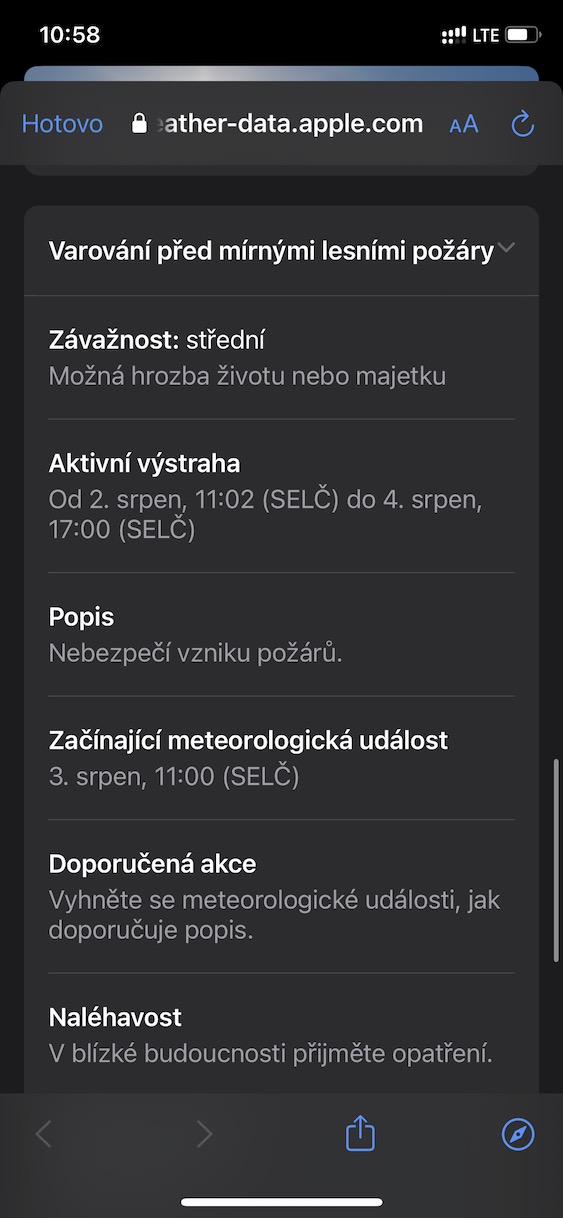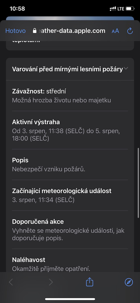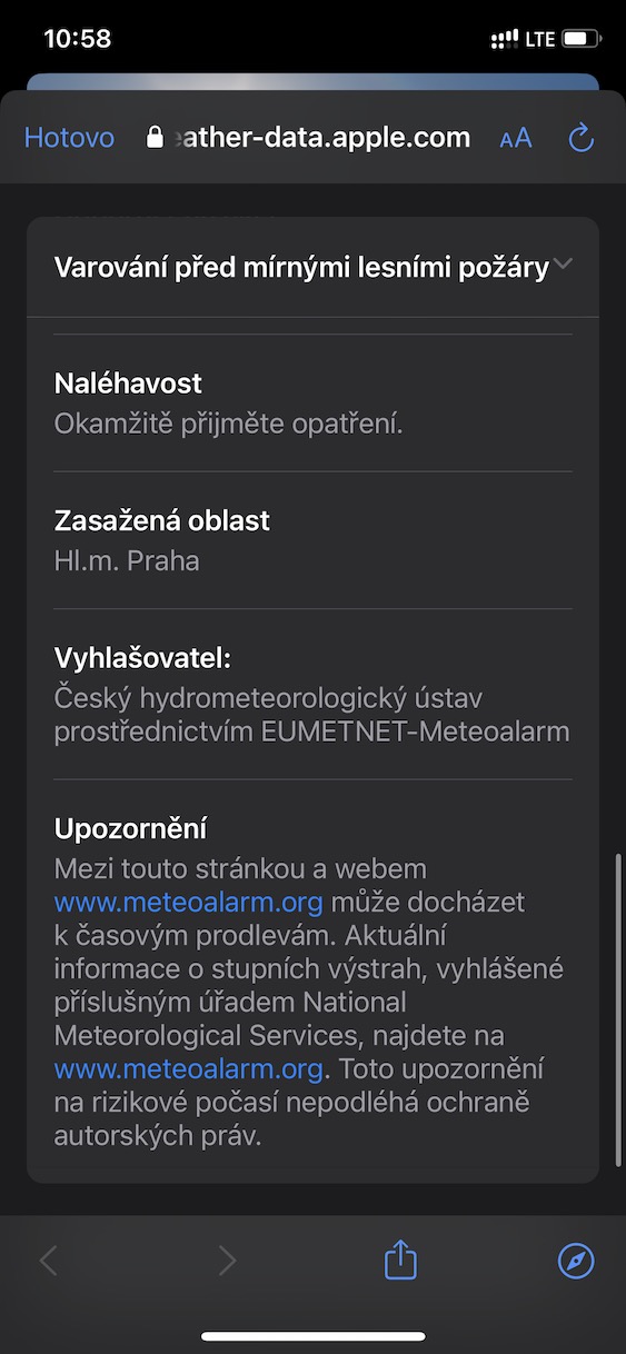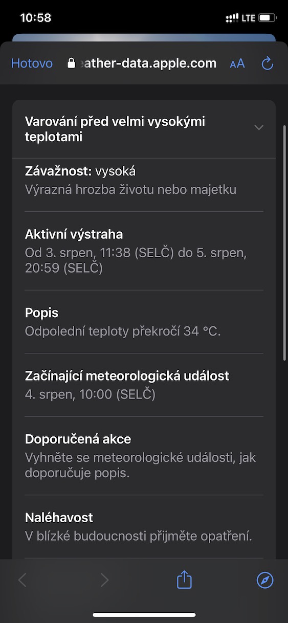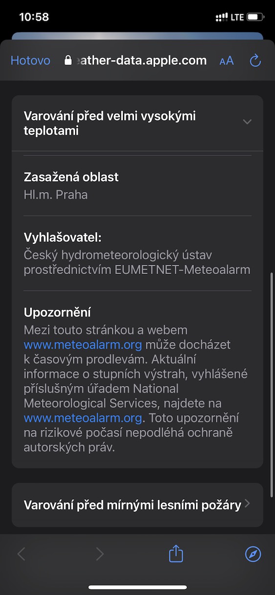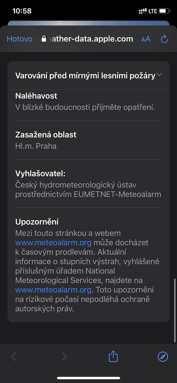 Pomocí výše uvedeného postupu je tedy možné na vašem iPhonu s iOS 16 v rámci aplikace Počasí zobrazit seznam všech platných výstrah počasí. Každou výstrahu si samozřejmě můžete rozkliknout, čímž se zobrazí veškeré potřebné podrobnosti. Konkrétně se vám zobrazí informace o závažnosti, datum a čas rozmezí platnosti, popis, doporučené akce, naléhavost, zasažená oblast a vyhlašovatel. O vydávání výstrah o počasí se v Česku stará ČHMÚ, upozornění pak do Počasí zprostředkovává meteoalarm.org.