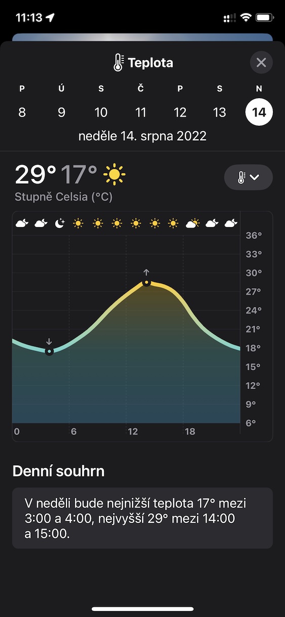 Pomocí výše uvedeného postupu je tedy možné na vašem iPhonu v Počasí z iOS 16 jednoduše zobrazit detailní předpověď v následujících 10 dnech. Jakmile si konkrétní den rozkliknete, tak se mezi jednotlivými kategoriemi s informacemi o počasí můžete přepínat klepnutím na ikonu se šipkou napravo, kde si pak stačí vybrat. K dispozici je zobrazení dat o teplotě, UV indexu, větru, dešti, pocitové teplotě, vlhkosti, dohlednosti a tlaku, a to nejen ve velkých českých městech, ale i v malých vesnicích, což doposud nebylo možné.