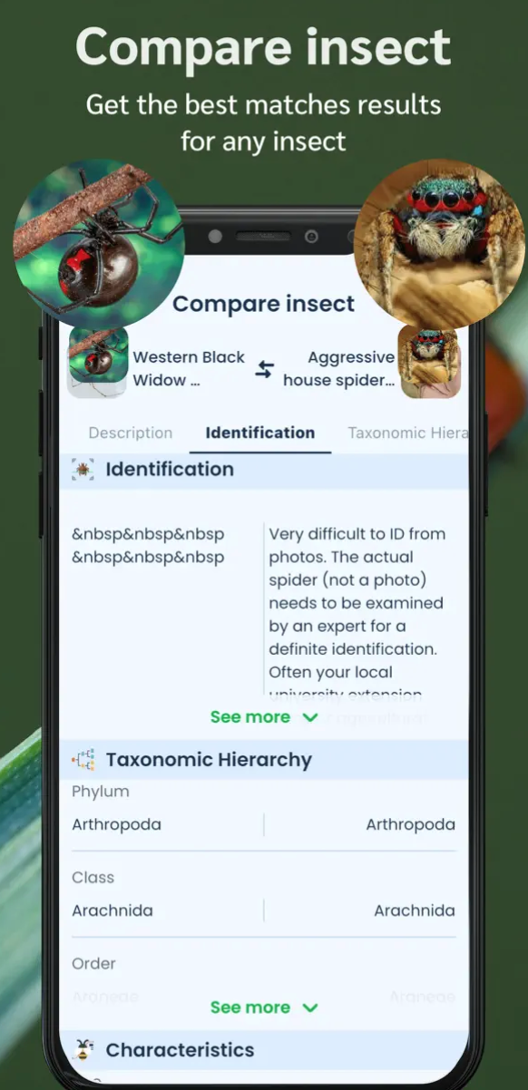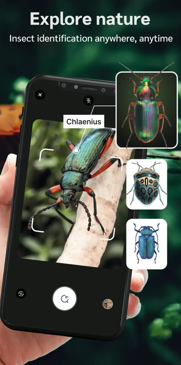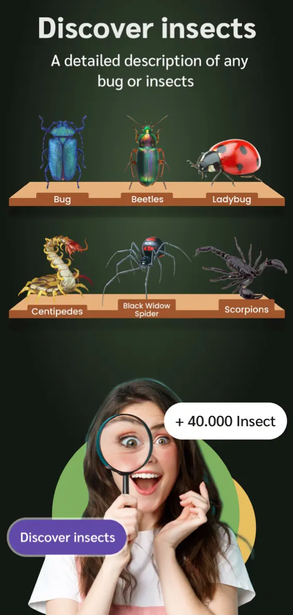 Tato aplikace vám pomůže prozkoumat kouzelný svět hmyzu. Kdykoli chcete vědět, s jakým živočichem máte tu čest, nebo se chcete o hmyzu dozvědět více, stačí namířit fotoaparát telefonu na hmyz, který chcete určit, nebo nahrát fotografii z vaší fotogalerie, a tato aplikace vám poskytne ty nejpřesnější výsledky.