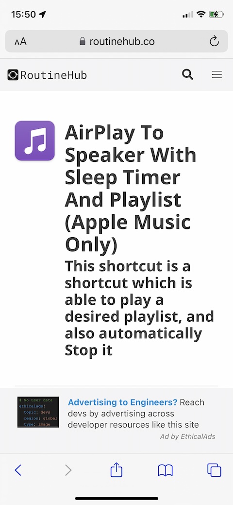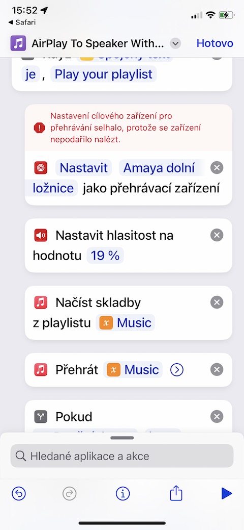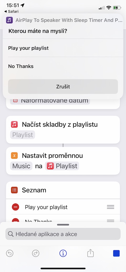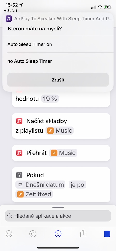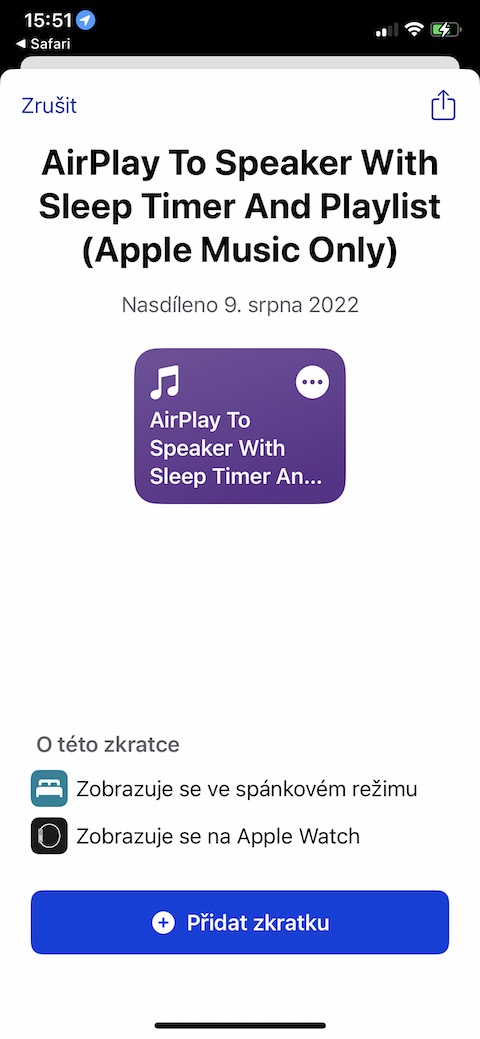 Zkratka s názvem AirPlay to Speaker with Sleep Timer vám v krátké chvíli umožní zahájit přehrávání vámi vybraného seznamu skladeb z Apple Music na vybrané Bluetooth zařízení se současným spuštěním časovače pro ukončení přehrávání. V nastavení zkratky bude před jejím spuštěním zapotřebí vybrat požadované Bluetooth zařízení spolu s požadovaným playlistem.