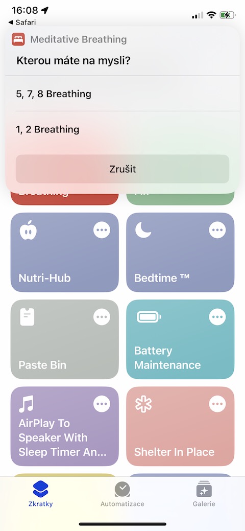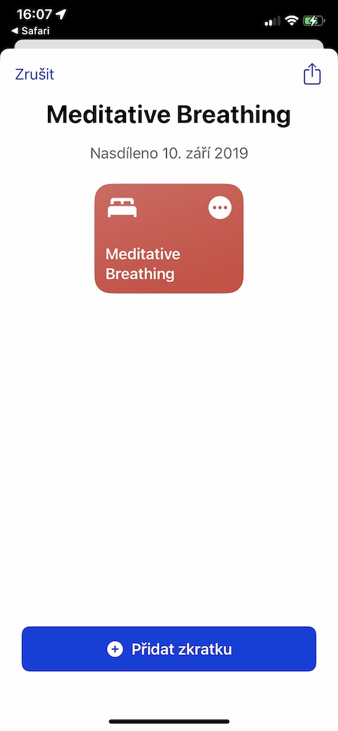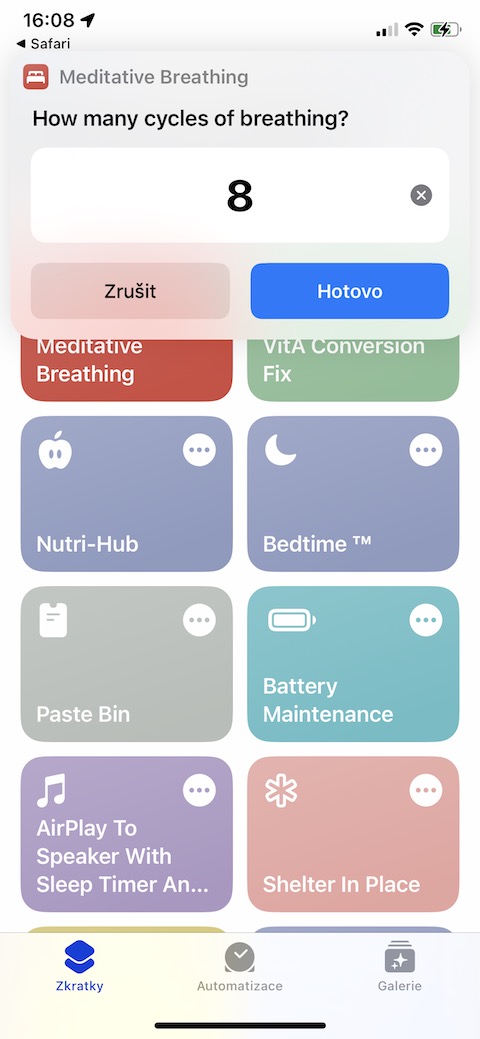 Zkratka s názvem Meditative Breathing vás provede dvěma různými druhy meditativních dechových cvičení. Na vás jenom bude, abyste vybrali požadovaný druh cvičení a počet dýchacích cyklů, a zkratka vám již prostřednictvím hlasové odezvy nebo notifikací na displeji vašeho iPhonu poskytne všechny potřebné instrukce.