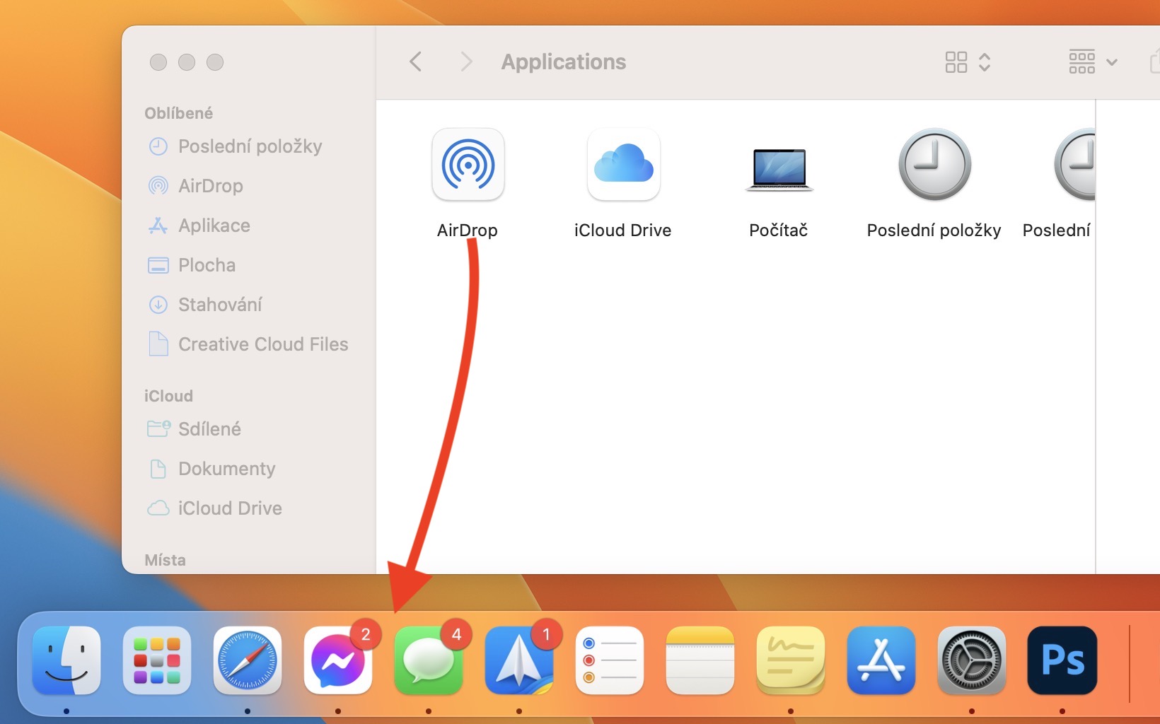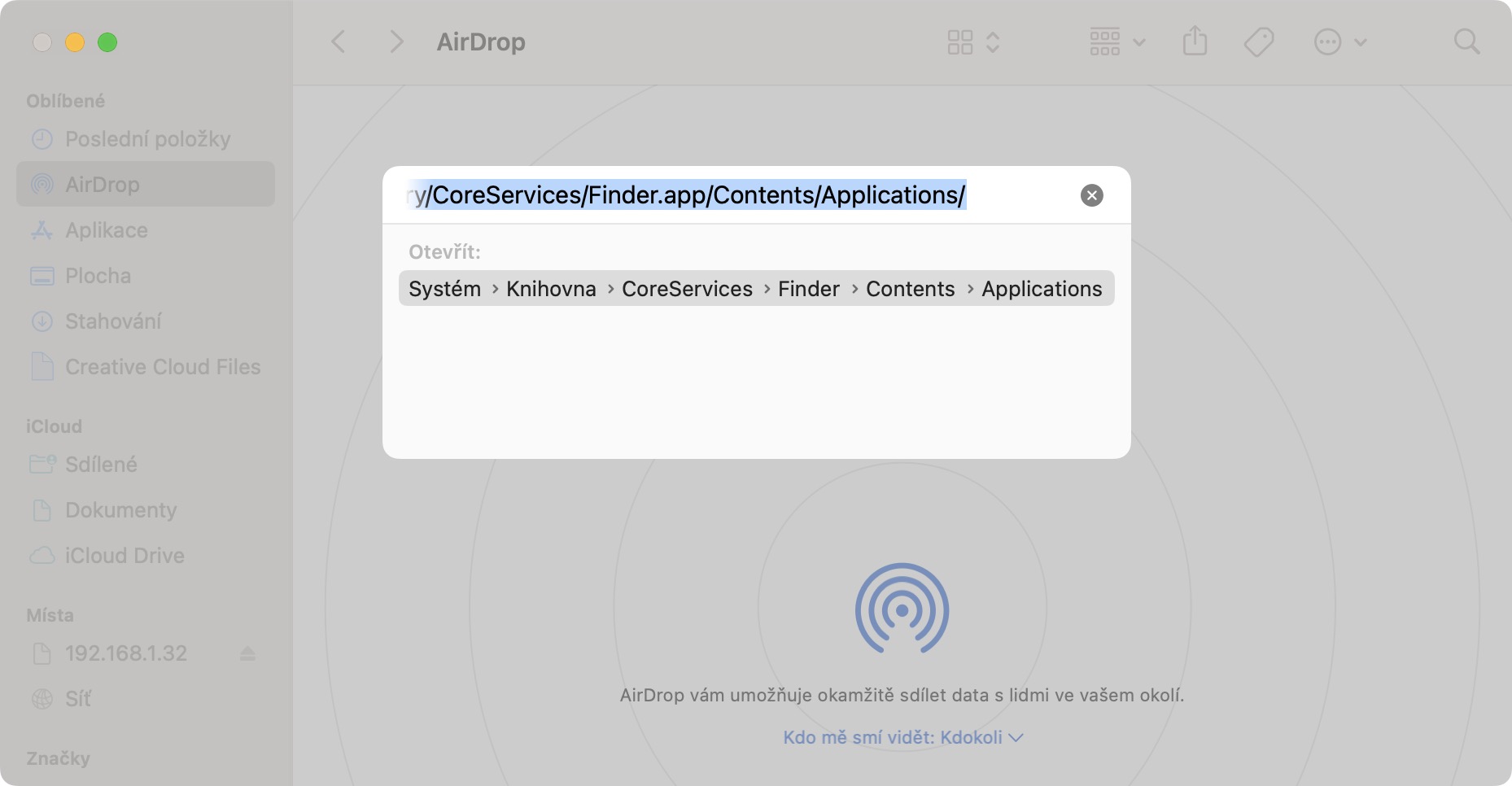 Věděli jste o tom, že si na Macu můžete skrytým způsobem přidat do Docku ikonu AirDropu, díky čemuž k němu získáte rychlý přístup? Nejedná se o nic složitého, pouze je třeba vědět, kam kliknout. Prvně na vašem Macu přejděte do Finderu, a poté v horní liště klepněte na Otevřít → Otevřít složku. Do okna, které se zobrazí, pak vložte cestu, kterou přikládám níže, a stiskněte Enter. Zobrazí se vám okno s některými aplikacemi, kde chytněte AirDrop a přesuňte jej klasicky do Docku. Následně můžete soubory skrze tuto ikonu sdílet pouhým přetažením, anebo na ni můžete kliknout, a poté přetáhnout soubory do okna.