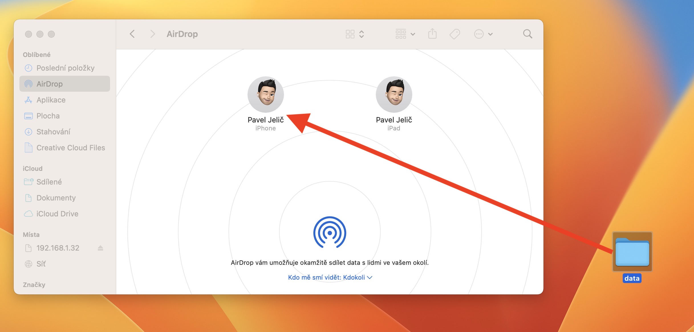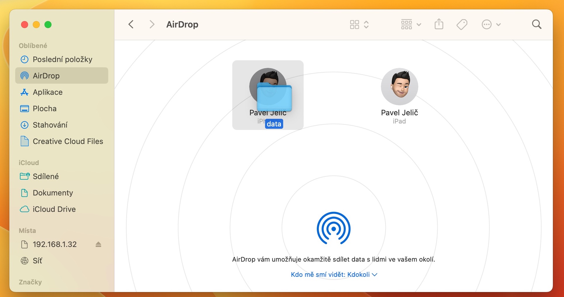 Prvním způsobem, jak můžete sdílet soubory na Macu skrze AirDrop, je v rámci Finderu. Nejedná se o nic složitého – prvně se do Finderu přesuňte, a poté v bočním panelu nalevo přejděte do sekce AirDrop. Jakmile tak učiníte, najděte si libovolná data, která chcete sdílet, a poté je přesuňte do tohoto okna na profil konkrétního uživatele, se kterým je chcete sdílet. Následně už dojde klasicky k odeslání. Popřípadě můžete data rovnou chytit, přesunout se kurzorem na AirDrop, a poté rovnou kurzorem přejet na jméno uživatele.