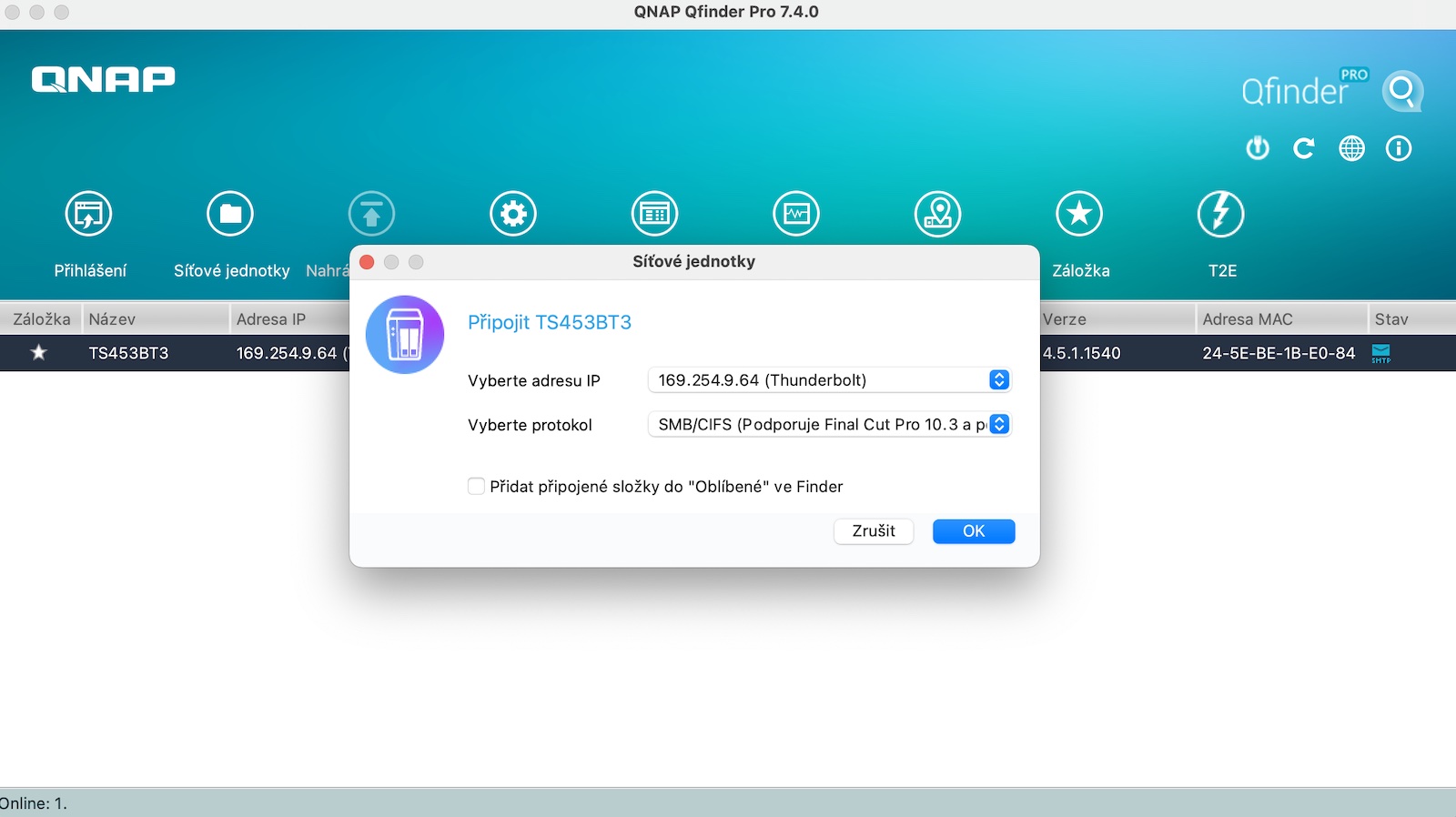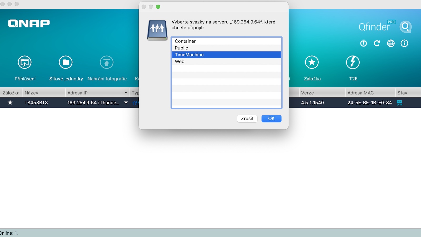 Ještě, než se pustíme do zmiňovaného nastavení, je potřeba nově vytvořený oddíl namapovat systémem. S tímto si dokáže v řádu vteřin poradit aplikace Qfinder Pro, kdy stačí nahoře zvolit možnost Síťové jednotky, přihlásit se, zvolit protokol SMB/CIFS a vybrat naši sdílenou složku. A nyní můžeme přejít na to nejzásadnější. Otevřeme si tedy Předvolby systému a přejdeme do kategorie Time Machine. Zde stačí klepnout na možnost Vybrat zálohovací disk, kde samozřejmě zvolíme náš disk, znovu zadáme přihlašovací údaje a máme hotovo.