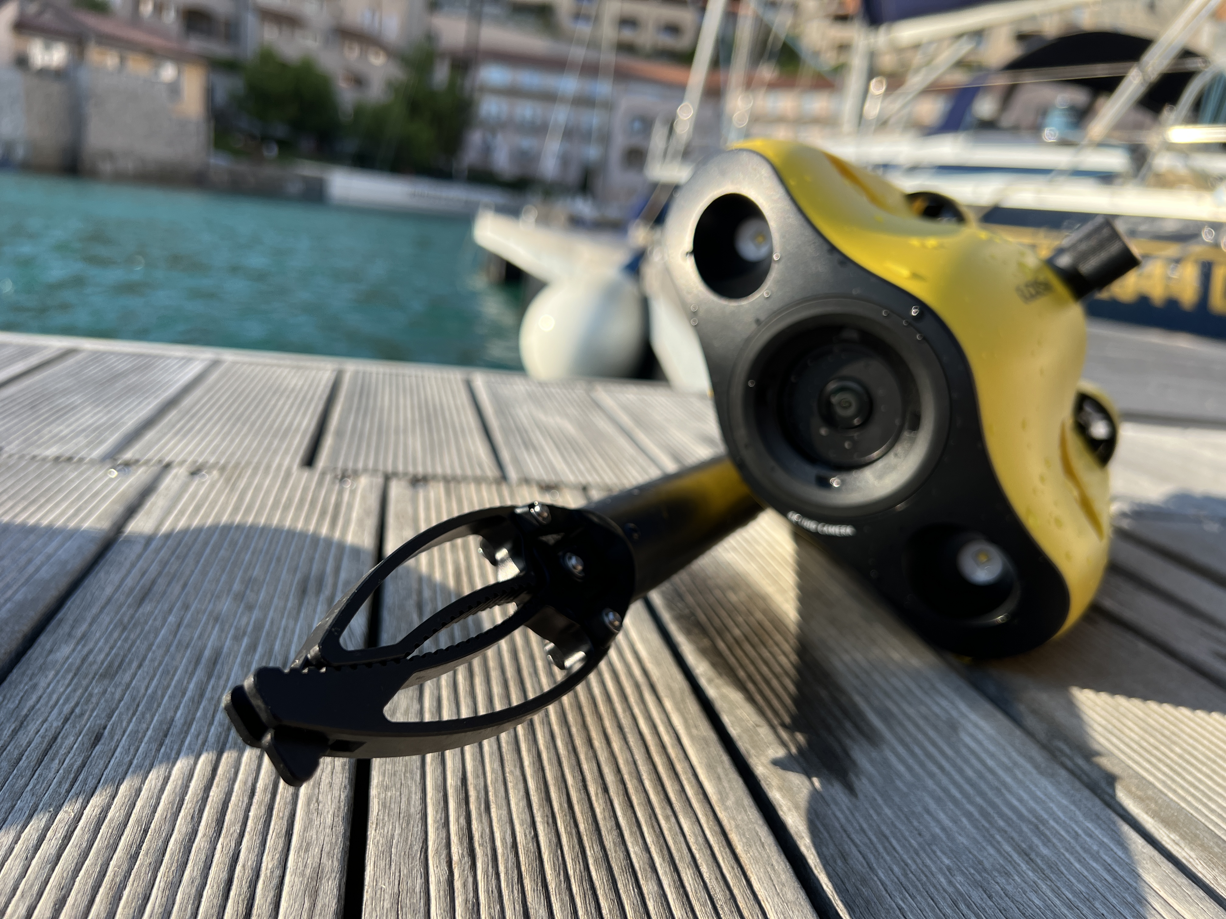 Ano, jsem idiot, ale nenapadlo mě nic lepšího než ji vyzkoušet tak, že zkusím, jak mi sevře prst. Až poté, co jsem heknul bolestí a měl jsem prst málem zlomený jsem si uvědomil, že celá tyč včetně oněch koncových čelistí je z kovu a servo starající se o sevření a roztažení čelisti má neuvěřitelnou sílu. Co sevřete, to hned tak nepustíte a pod vodou tak můžete lovit nejrůznější předměty, především pak ideálně ty, které tam nemají co dělat. Pokud máte například loď, můžete dronem provést inspekci trupu a pomocí čelisti pak odstranit znečištění, které na něm nemá co dělat nebo vyčistit zamotané věci na lodním šroubu. Chce to sice cvik a první pokusy něco ve vodě vytáhnout budou připomínat lovení plyšáků z výherního automatu, ale po pár hodinách tréninku si začnete být víc jistí a přijde ta pravá legrace.