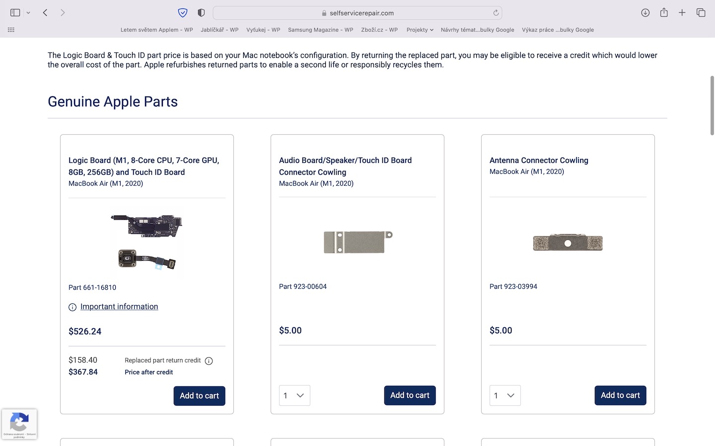 Prvně se společně podíváme na cenu náhradních dílů pro MacBook Air M1, který je mezi uživateli nejoblíbenější a nejrozšířenější. Pokud byste se rozhodli pro výměnu samostatné baterie, což je asi nejčastější servisní úkon, tak je cena stanovena na 119.25 dolarů, každopádně pokud vrátíte starou použitou baterii, tak získáte kredit v hodnotě 22.50 dolarů, čímž oprava vyjde na 96.75 dolarů (2 400 Kč). K baterii byste pak měli samozřejmě zakoupit ještě nové lepení v ceně 9 dolarů, společně se šroubky, které jsou balené vždy po pěti kusech a vychází na 5 dolarů. Takový displej vás vyjde na 395.12 dolarů, respektive na 307.12 dolarů (7 500 Kč) po vrácení starého kusu, za který dostanete kredit 88 dolarů. I v tomto případě byste měli sáhnout po nových šroubcích, byť to samozřejmě není vyloženě nutné, pokud je nestrhnete. Zvuková deska pak vychází na 12 dolarů (300 Kč) a její flex kabel na 5 dolarů (130 Kč), spodní kryt na 69.52 dolarů (1 600 Kč), kompletní sadu nových kláves pořídíte za 39 dolarů (1 000 Kč), reproduktory vychází na 29 dolarů (700 Kč) a například modul Touch ID na 60.70 dolarů (1 500 Kč) po vrácení starého kusu, za který dostanete kredit 26.40 dolarů. Nejvyšší je cena za novou základní desku, která začíná na 367.84 dolarech (9 000 Kč) při vrácení staré desky, za kterou dostanete kredit 158.40 dolarů. Samozřejmě ale cena stoupá v závislosti na konfiguraci.