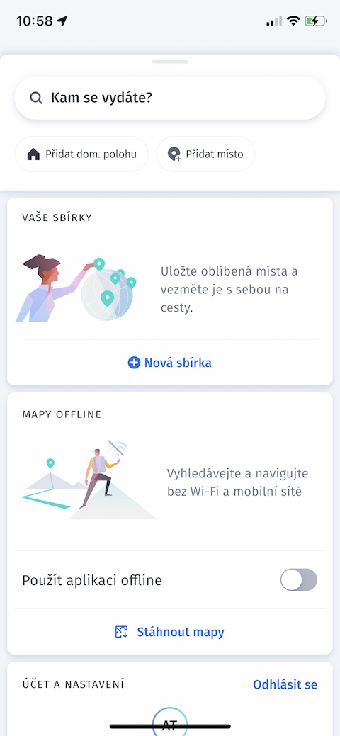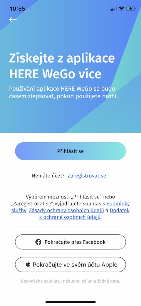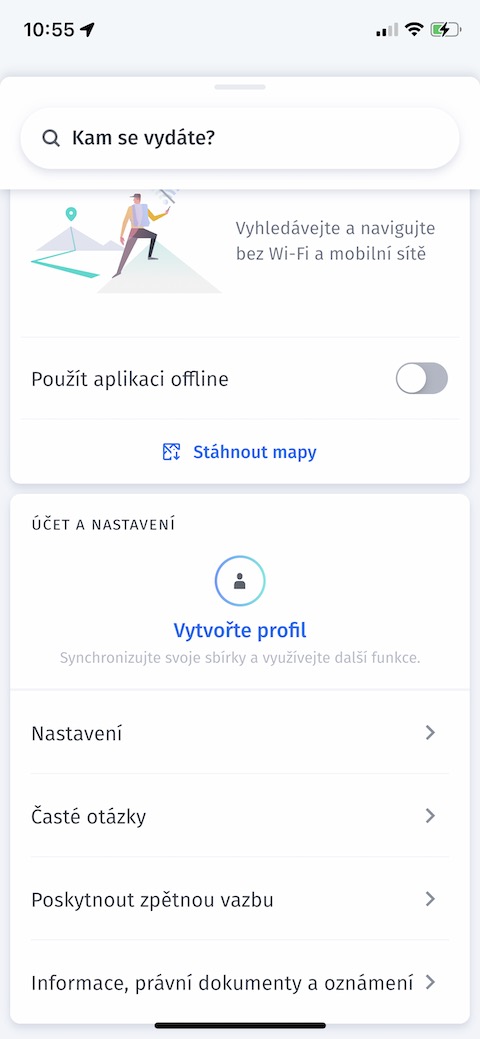 Pokud jste si aplikaci Here WeGo stáhli do iPhonu poprvé a chcete ji využívat opravdu naplno, vyplatí se vytvořit profil. Na hlavní obrazovce zamiřte o něco níže a v sekci Účet a nastavení klepněte na Vytvořte profil. Zvolte preferovaný způsob registrace a potvrďte.