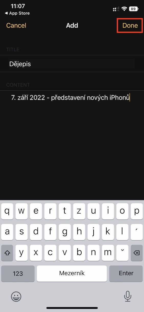 - Následně, po vložení potřebných údajů, klepněte na Done vpravo nahoře.