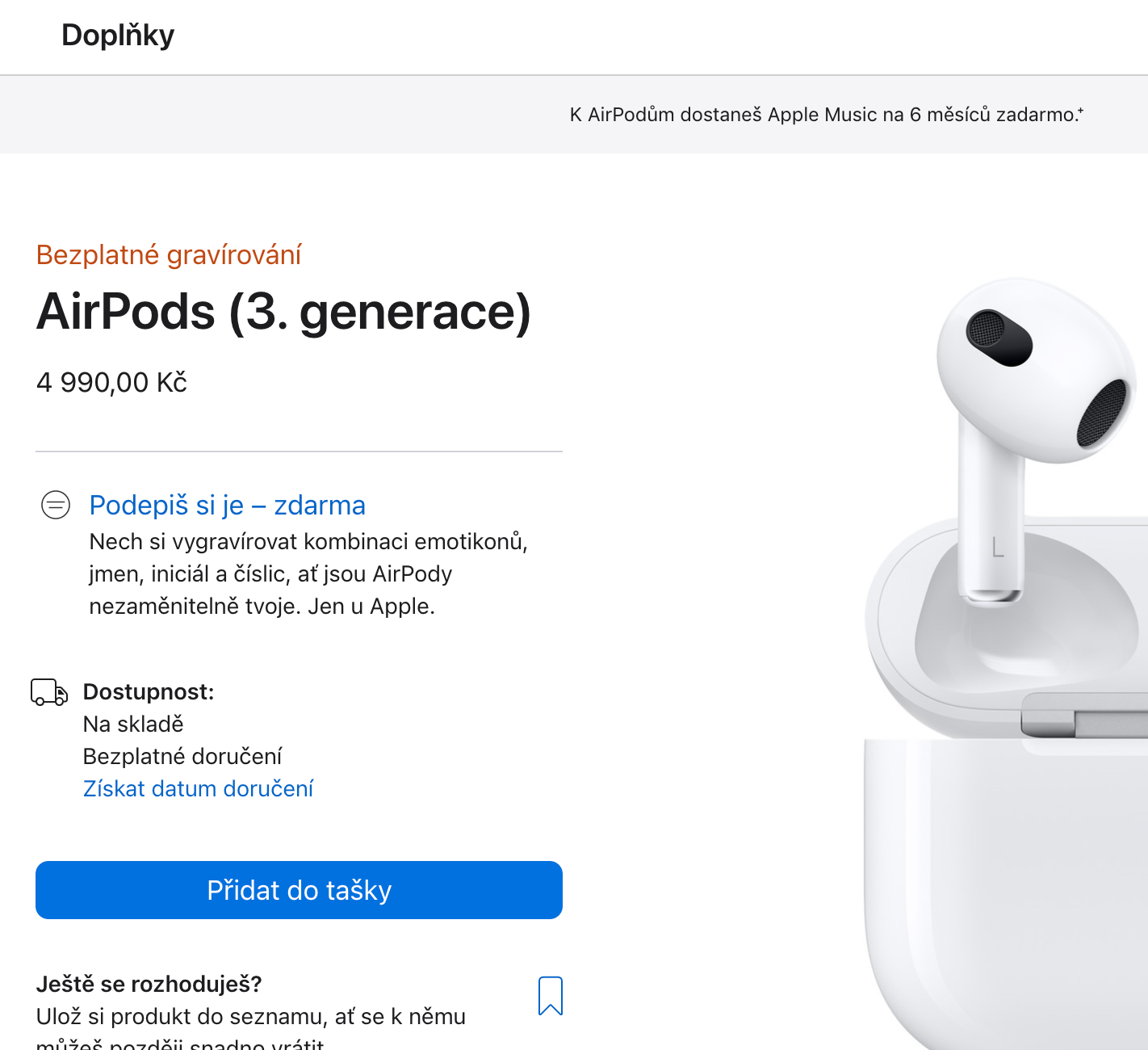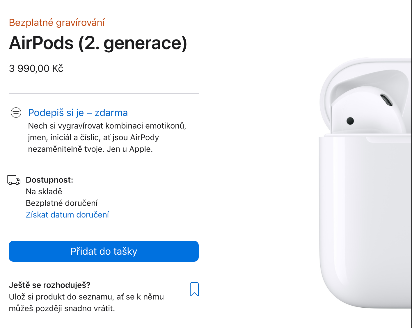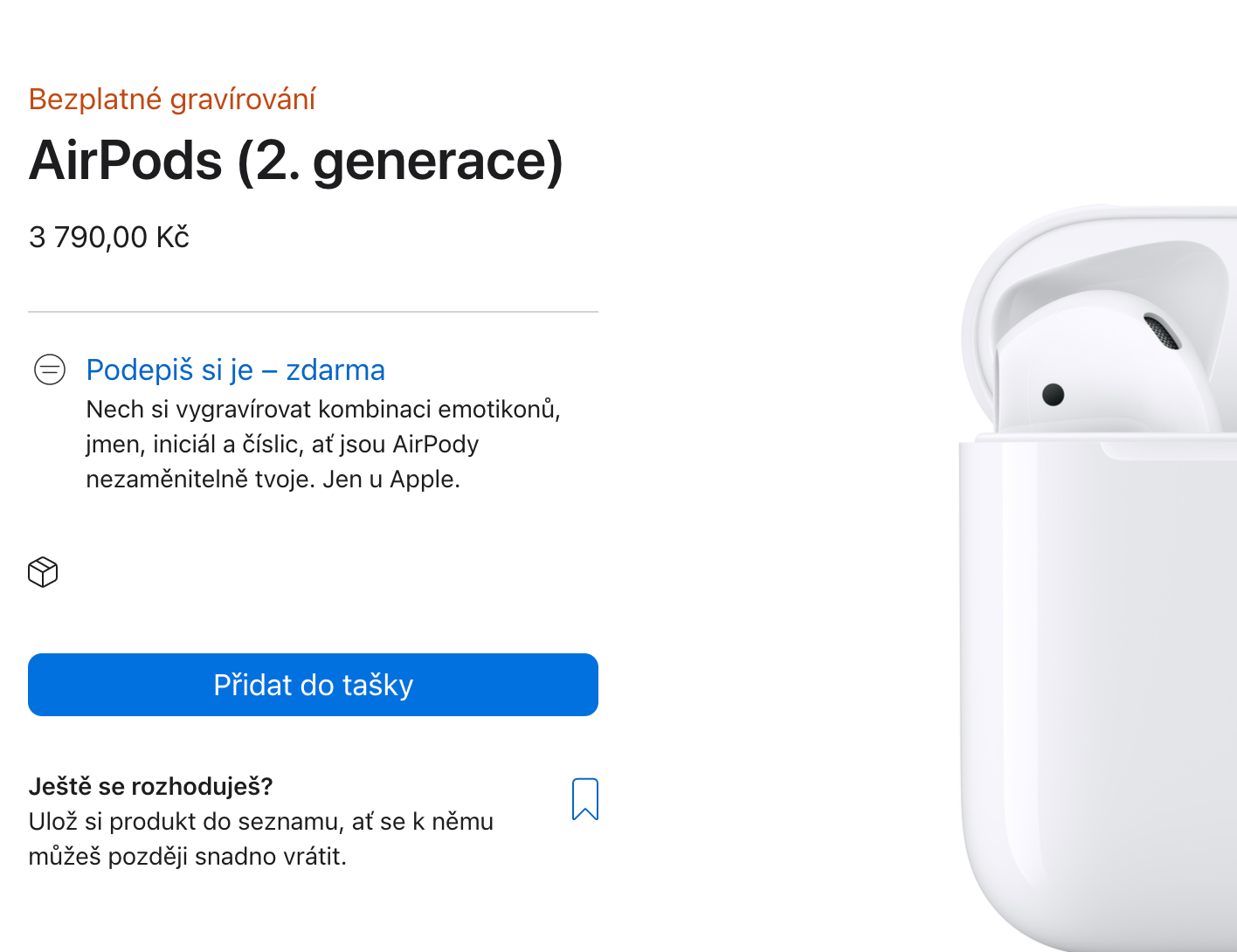 Apple zdražil AirPody 2. a 3. generace. Zatímco ještě v létě letošního roku činila cena AirPodů 2. generace 3790 korun, dnes činí 3990 korun – přesvědčit se o tom můžete na screenshotech z webového archivu v přiložené galerii.