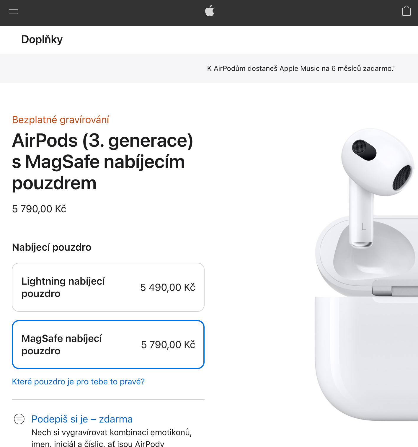 Podobný osud potkal sluchátka AirPods 3. generace, jejichž cena dnes činí 5490 korun s Lightning nabíjecím pouzdrem a 5790 korun s MagSafe pouzdrem, zatímco v srpnu činila cena sluchátek s Lightning pouzdrem 4990 korun.