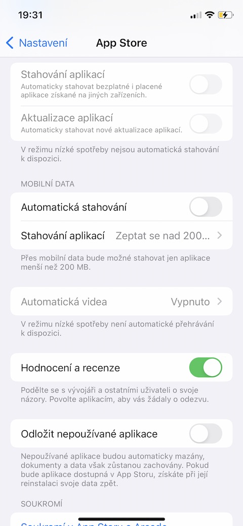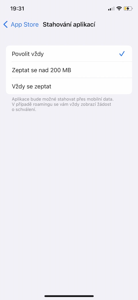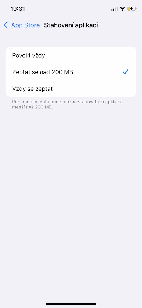 Někdy se může stát, že příčinou nemožnosti stahování aplikací je omezení v oblasti mobilních dat. V takovém případě by se sice na displeji vašeho iPhonu mělo objevit příslušné upozornění, někdy k tomu ale vinou dílčích chyb nemusí dojít. Spusťte na iPhonu Nastavení -> App Store. Zamíříte do sekce Mobilní data a zde zkontrolujte, zda nemáte aktivované omezení v případě stahování a aktualizace aplikací přes mobilní datovou síť.