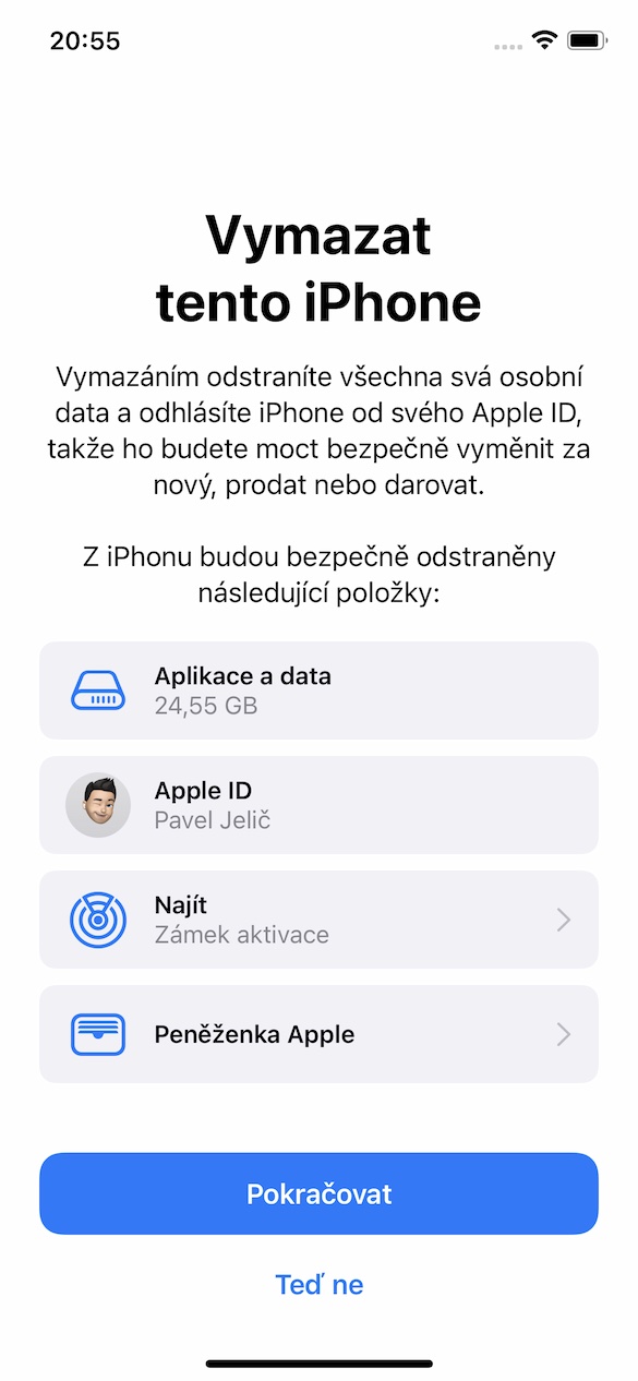 Aby mohl potencionální kupec iPhone naplno využívat, tak je nutné, aby byl odhlášený z vašeho Apple ID. Pokud byste tak neučinili, tak by byl iPhone pořád vázaný na váš účet společně s heslem, které by musel nový uživatel zadávat. Odhlášení docílíte tak, že rozkliknete Nastavení, kde klikněte na vaše jméno. Poté sjeďte úplně dolů a klikněte na možnost Odhlásit se. Poté už jen stačí zadat vaše současné heslo a akci potvrdit.