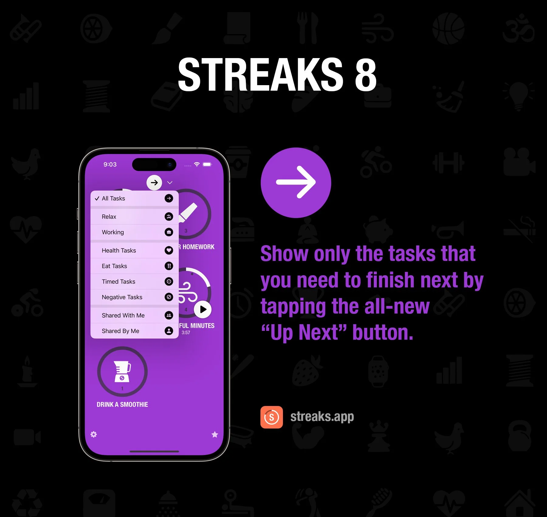 - Streaks – zobrazení následujících úkolů, jejich stavu a statistik