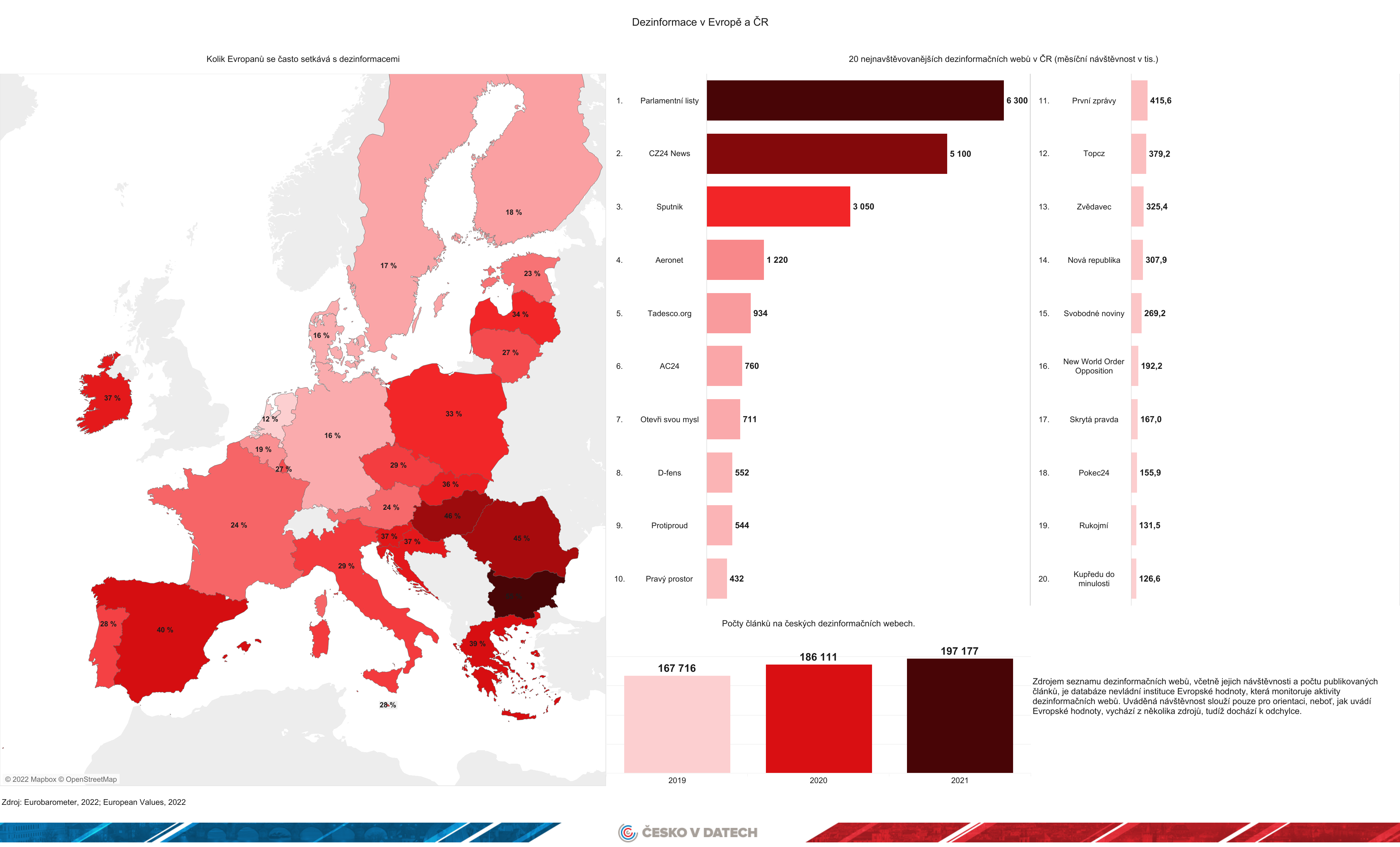 „Zatímco v roce 2018 bylo 67 % obyvatel Česka přesvědčeno, že dokáží v mediálním prostoru dezinformace rozeznat, letos tento podíl klesl na 56 %. V porovnání s ostatními evropskými státy se s 4. nejnižší hodnotou řadíme téměř na konec žebříčku,“ vysvětluje Milan Mařík, analytik projektu Česko v datech. Zatímco tedy stoupá počet dezinformačních článků, čím dál méně lidí je přesvědčeno o tom, že dokáže tento obsah odlišit od ostatních zpráv.