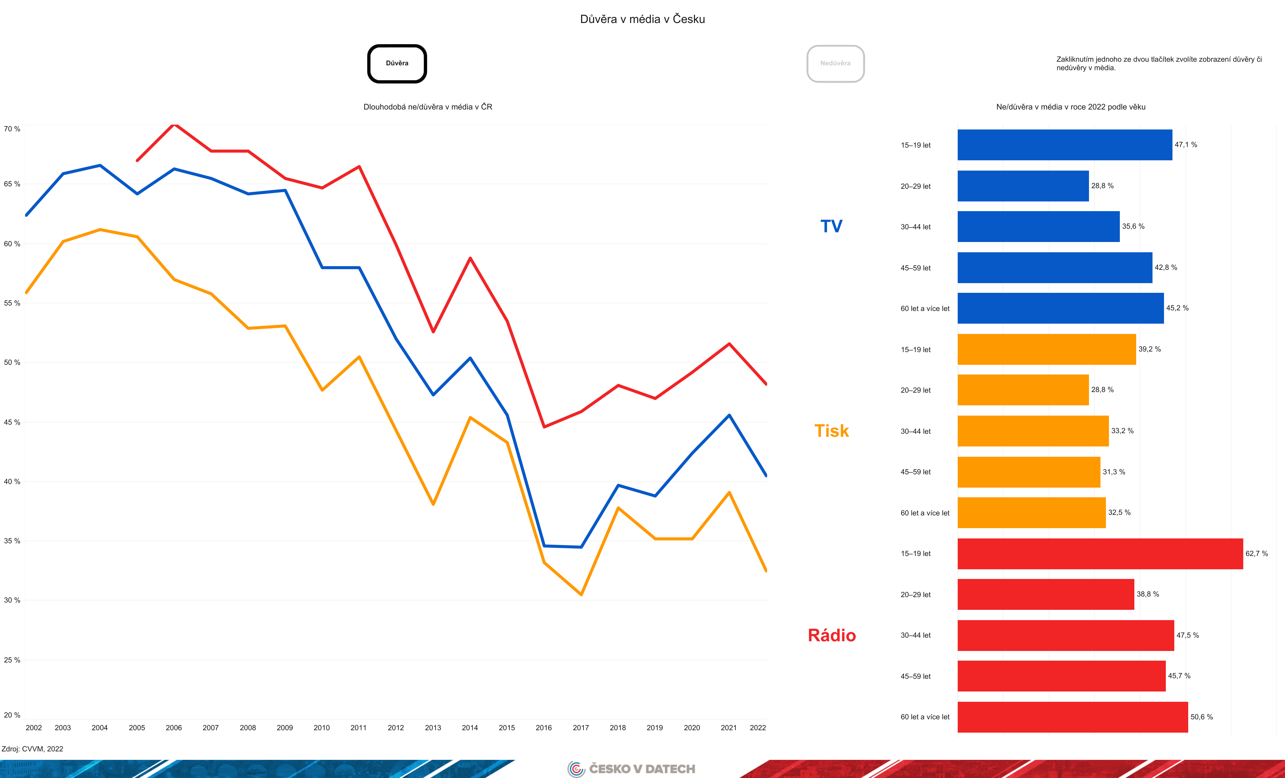 „Lidé často deklarují, že nevěří bulváru nebo komerčním televizím, ale nakonec po nich stejně sáhnou, protože neodolají zábavě a šokujícím titulkům,” říká Nikola Hořejš, který se věnuje výzkumu dezinformací a médií v sociologickém ústavu STEM. „Důvěra vzniká různě. Největší roli hraje naše fandící mentalita – věříme tomu médiu, které zastává nám blízké názory. U lidí okolo 25 let zase vidíme, že když se začnou zajímat o politiku a veřejné dění, řídí se nejvíce podle sociálních médií a influencerů,” dodává Hořejš.