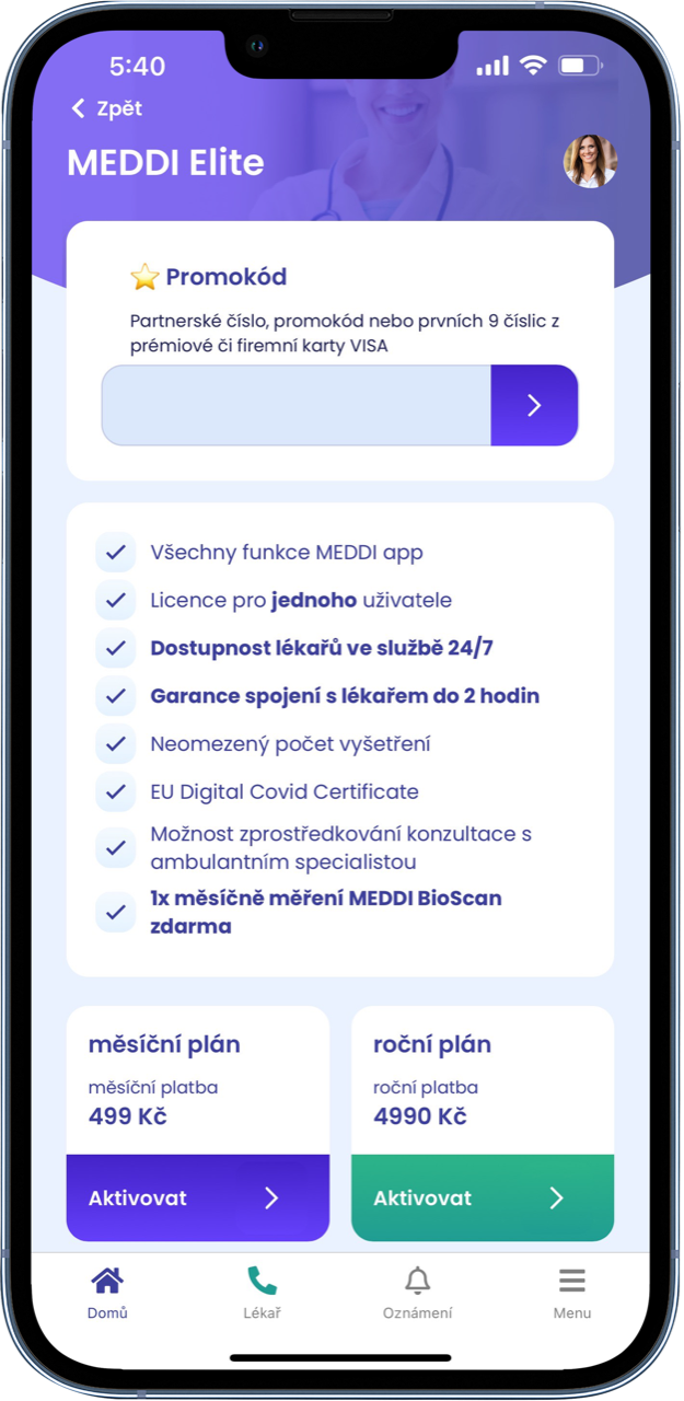 Nyní máte navíc možnost vyzkoušet si lékaře na telefonu na tři měsíce zdarma v rámci spolupráce společností CZC.cz a MEDDI hub. Stačí zakoupit jeden z výrobků v kategorii CZC.Health označený štítkem MEDDI, stáhnout aplikaci MEDDI app v Google Play nebo App Store a vložit promokód pro předplatné MEDDI Elite zdarma na tři měsíce. Služby můžete začít využívat okamžitě a v nadcházejícím období plném viróz a nachlazení tak ušetřit drahocenný čas strávený v čekárnách.